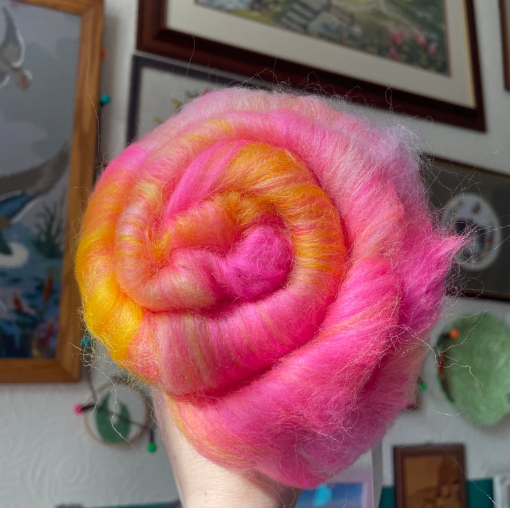 50/50 Merino and Corriedale wools, blended by Sammy in her home studio. Inspired by my muse, Mr Blobby, this pink and yellow batt has been an idea I just had to bring to life.