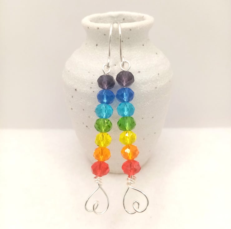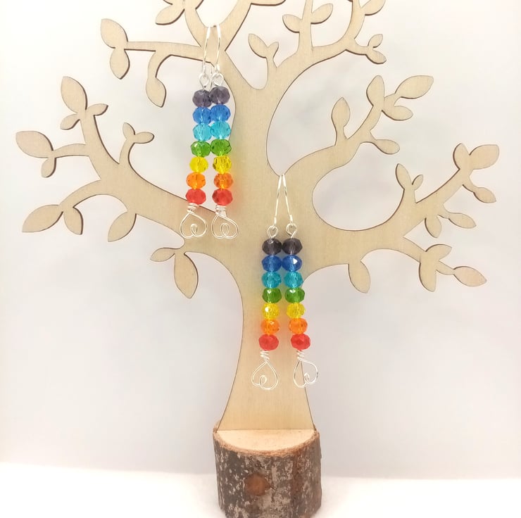 These chakra bead dangle earrings are made using 6mm faceted crystal glass Briolette rondelle beads and are finished off with a dainty little love heart design on the base.