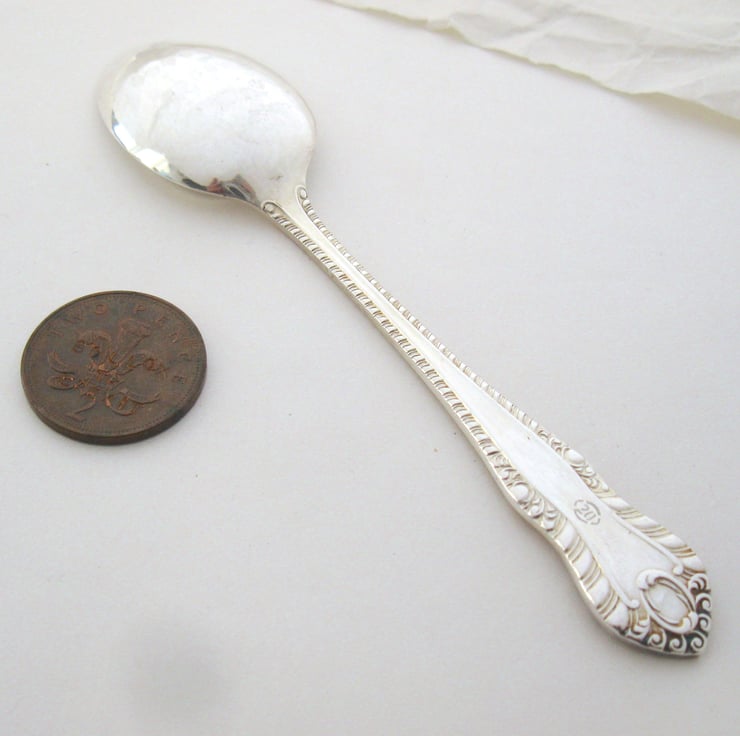 It's a silver-plated tea spoon measuring approx. 14cm long and has a 'gadroon' edge to the handle. The detail is repeated on the back. The lettering is blacked with water-based acrylic pigment and will last longer if you gently hand wash it rather than putting it in the dishwasher.