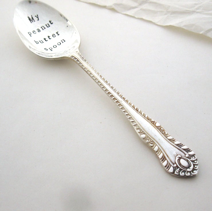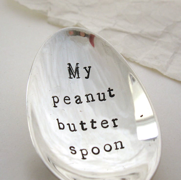A handstamped vintage teaspoon that says 'My peanut butter spoon' in the bowl. It's a slight second: the capital 'M' bounced because I hit it too hard and has left a double impression. This in no way affects its function as a spoon but it's gone into the bargain bin on aesthetic grounds!