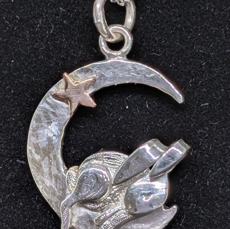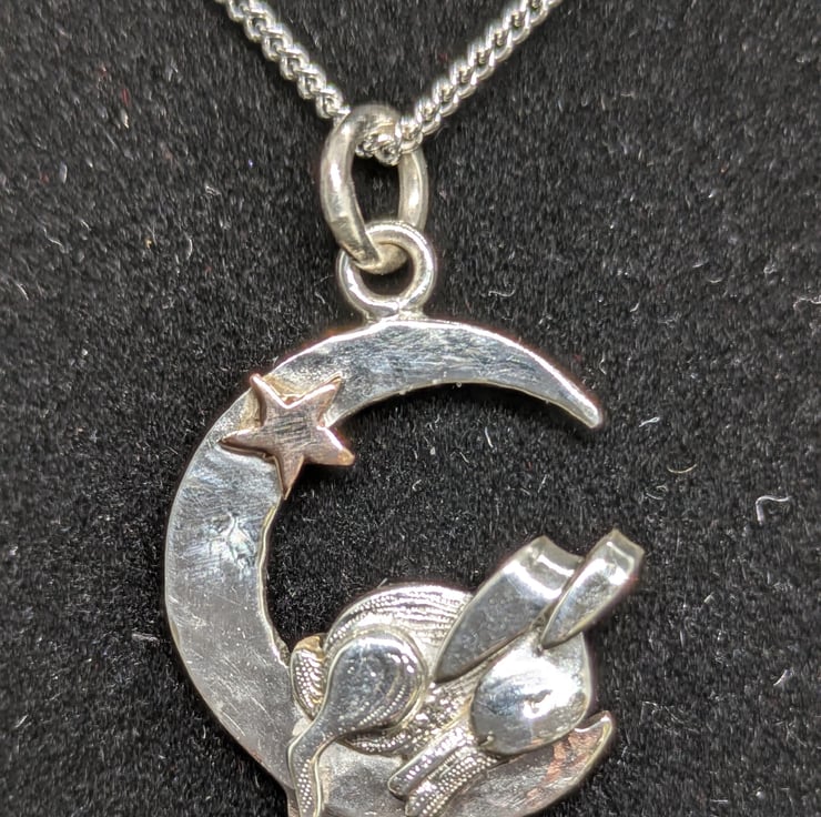 Ever been so tired you just can't keep your ears up anymore? This handmade sterling silver hare is that sleepy. Made from four hand saw pierced silver pieces, this sleepy bunny rests on a hammered sterling silver moon. A 9 carat red gold, hand saw pierced star twinkles above him. This unique piece would be the perfect gift for anyone who loves hares, rabbits or bunnies. The pendant measures approximately 2cm across and it hangs from an 18 inch, 1.2mm sterling silver curb chain.