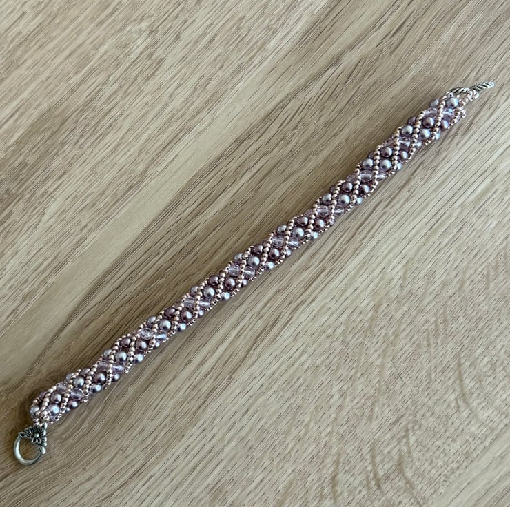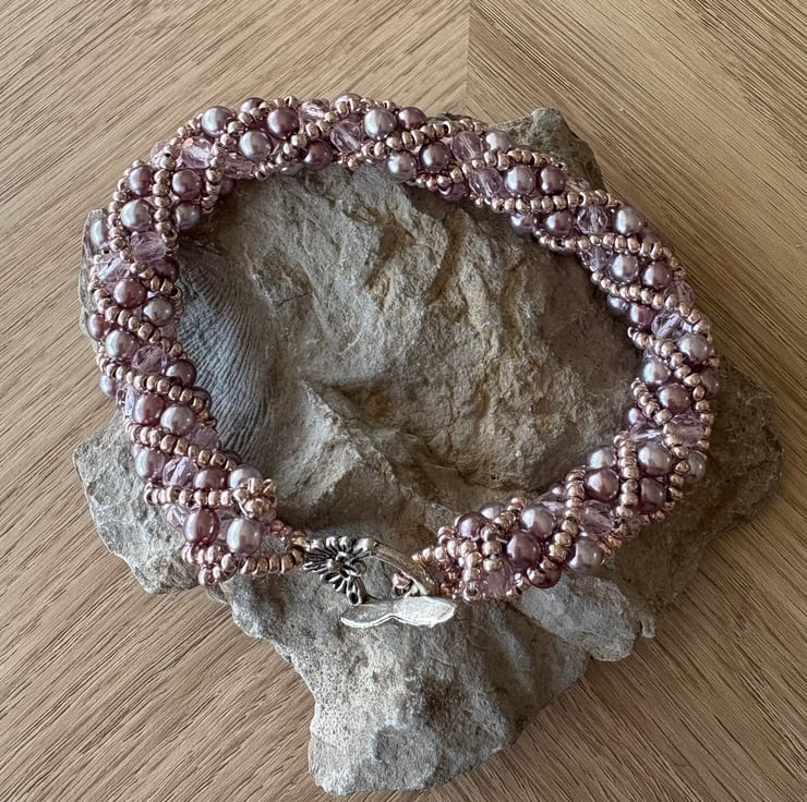 Delicate woven beaded bracelet in pale purple/pink. This is made from pinky glass pearls, fire polished beads and pink seed beads and fastened with a decorative toggle clasp. Length from end to end including clasp 21cm.