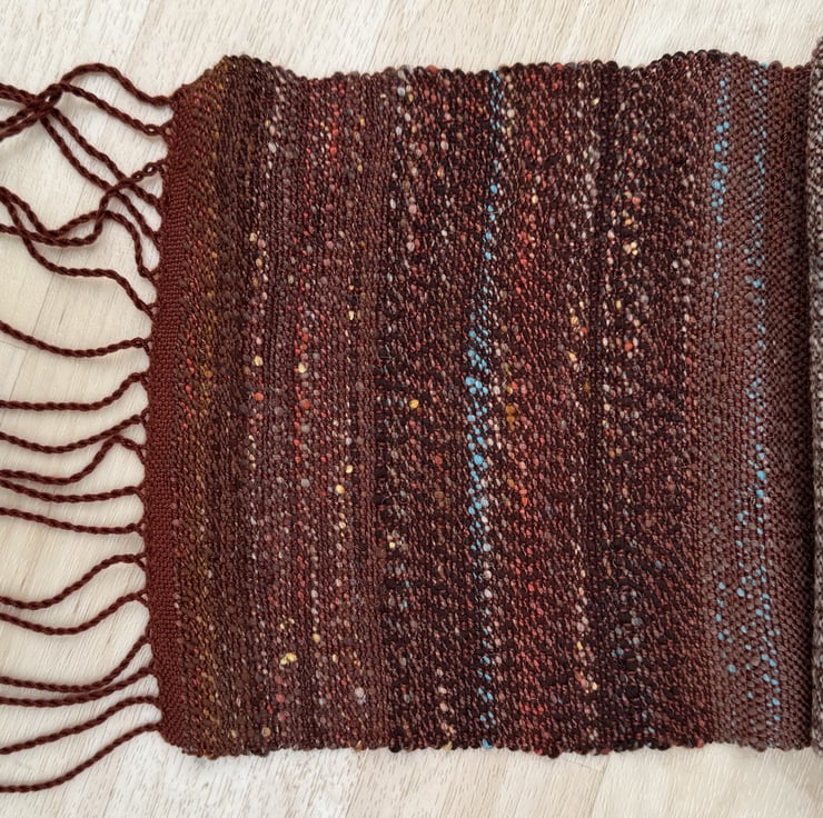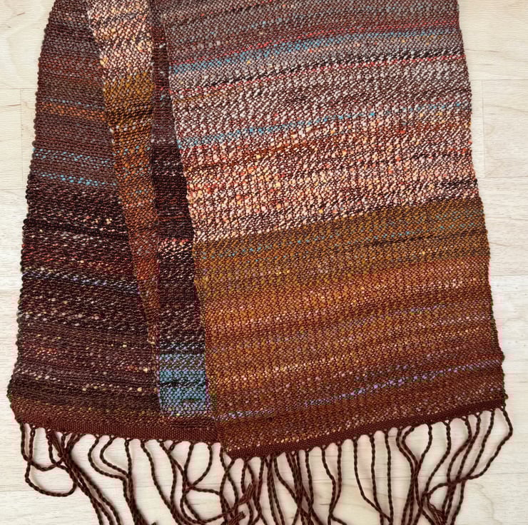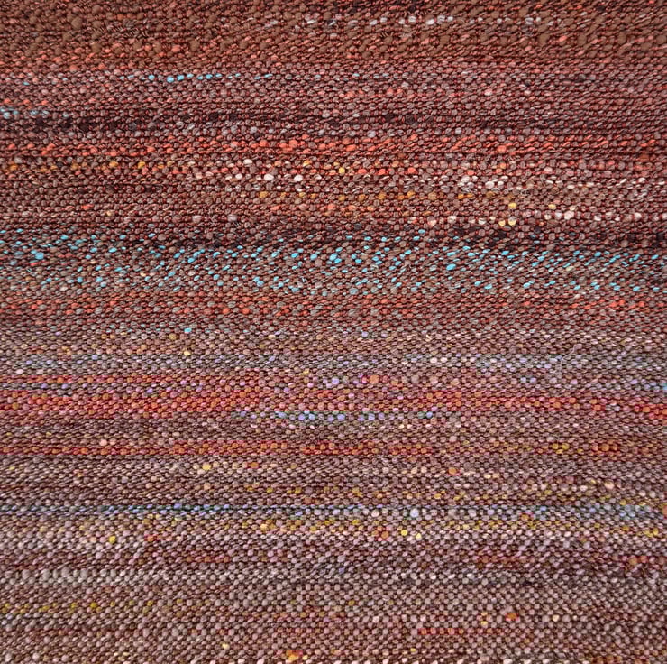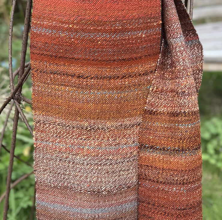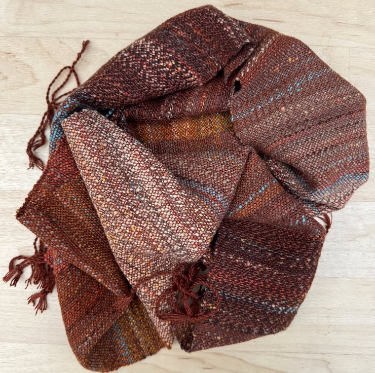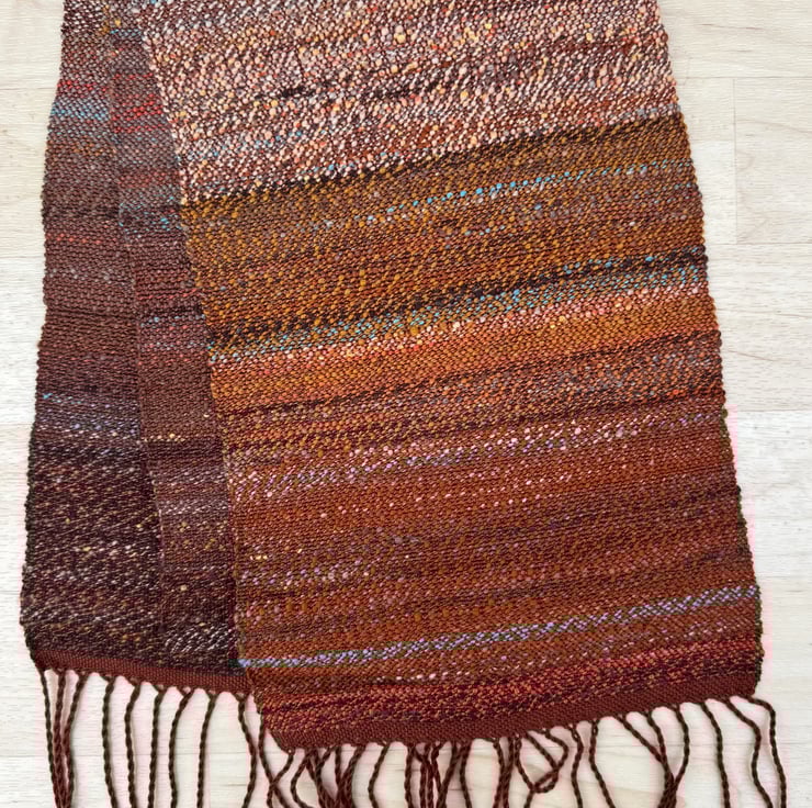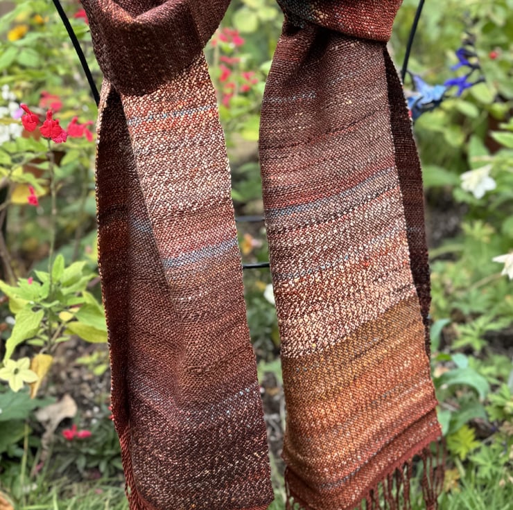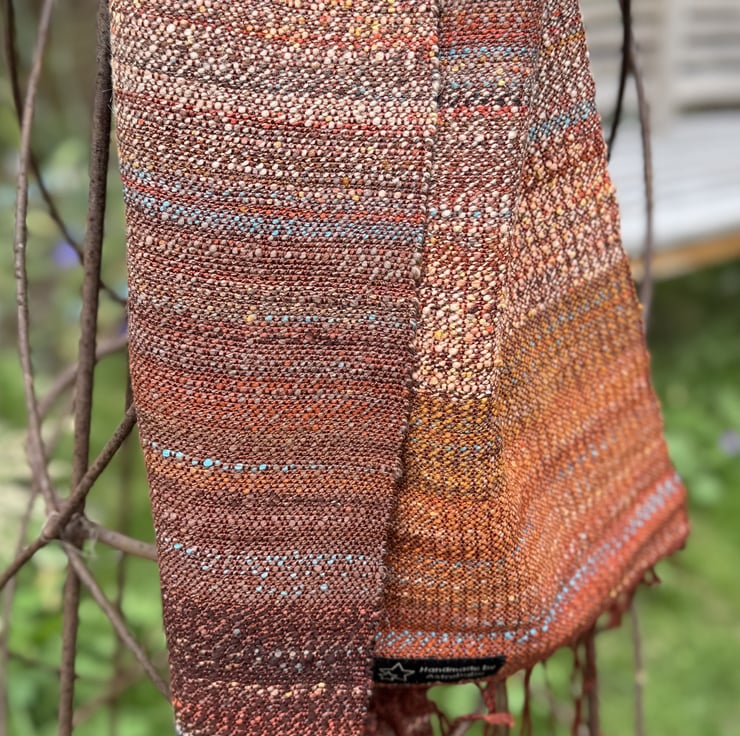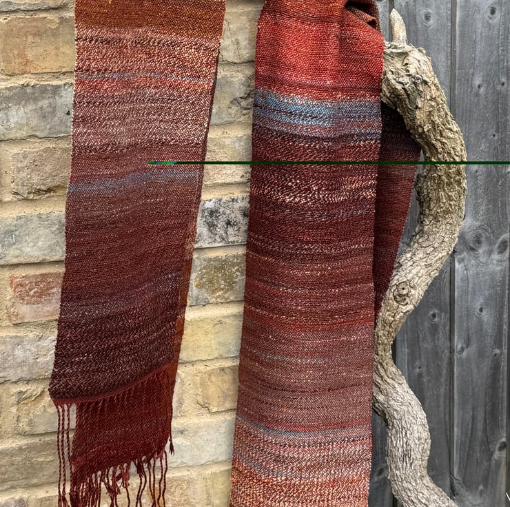 The scarf is hand-woven in plain weave, varying in the way the colours change and blend along its length. The main theme is deep terracotta/rust red/brown, and this is livened by splashes of a light turquoise blue, pale ochre and dark brown. The weft colours come from my own blended and hand-spun yarn, which is woven onto a warp of silky clay red tencel. Two scarves are available, slightly different from each other in the way the colours mix and merge. They are each 23cm wide and 154cm long (excluding the tassels). Wash at 30 degrees, line dry and press with a cool iron.