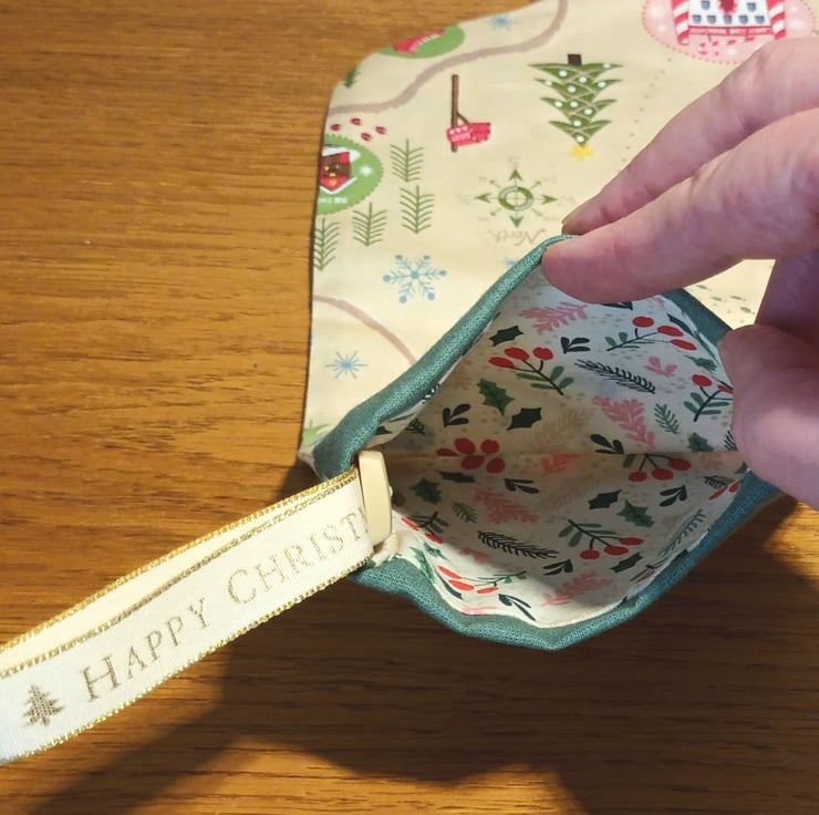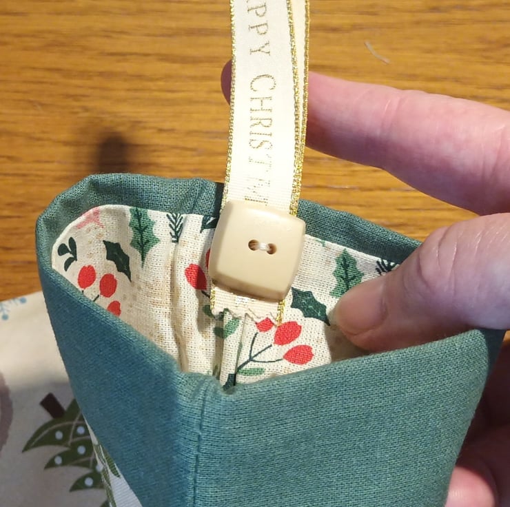 The stocking is hung by cream and gold "Happy Christmas" ribbon which is attached to the inside with a matching button.