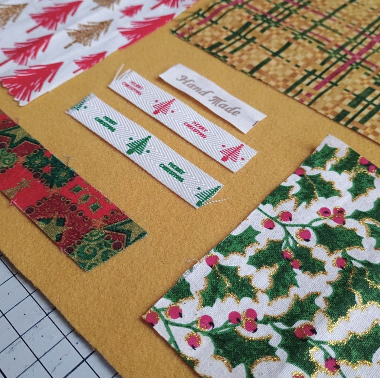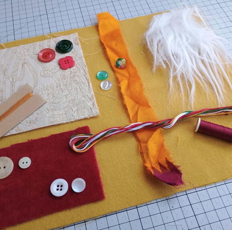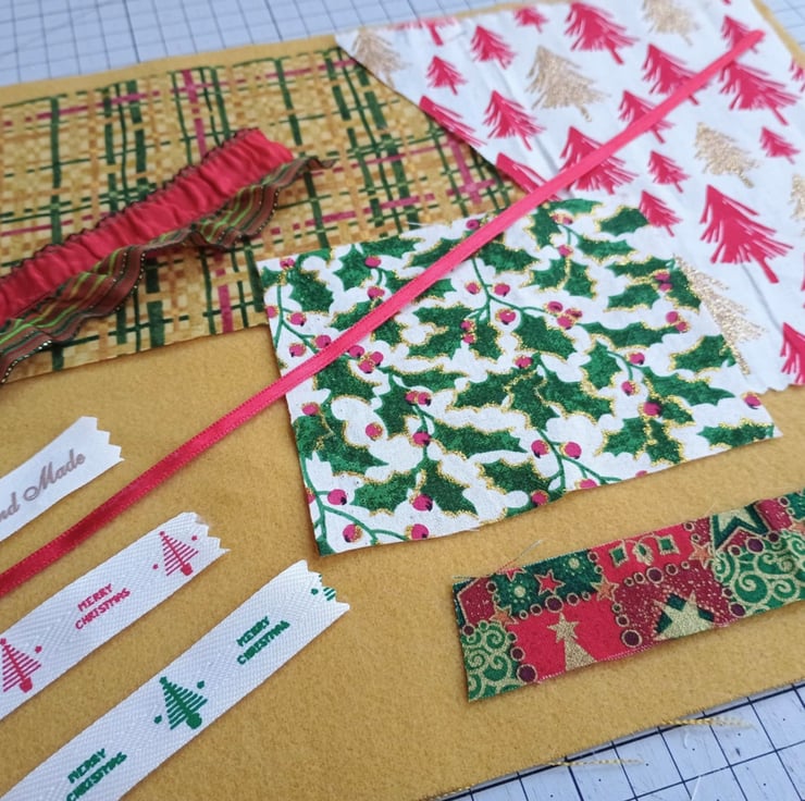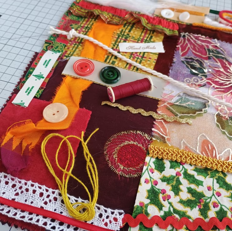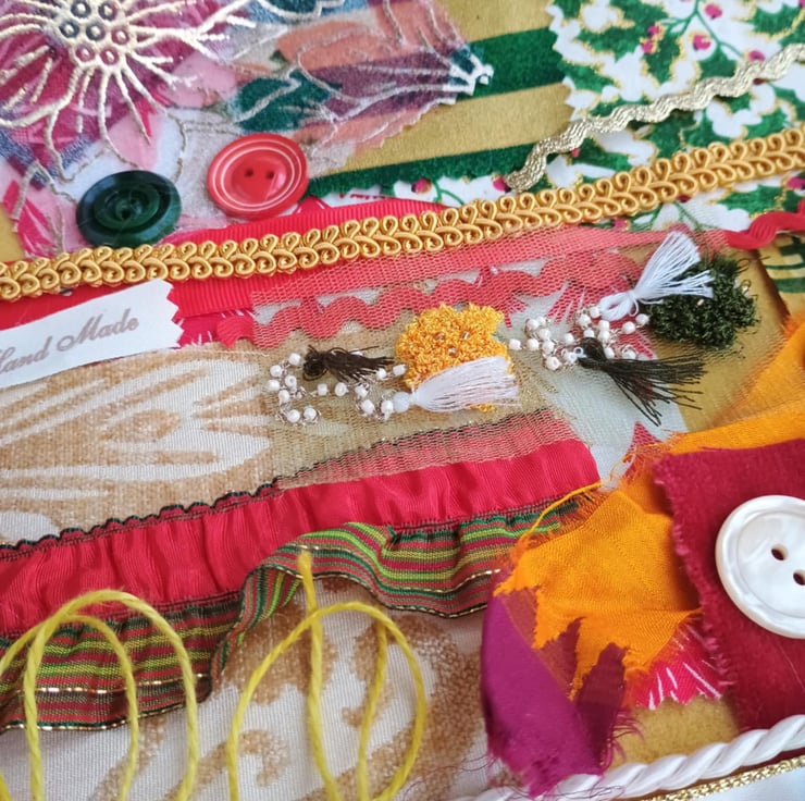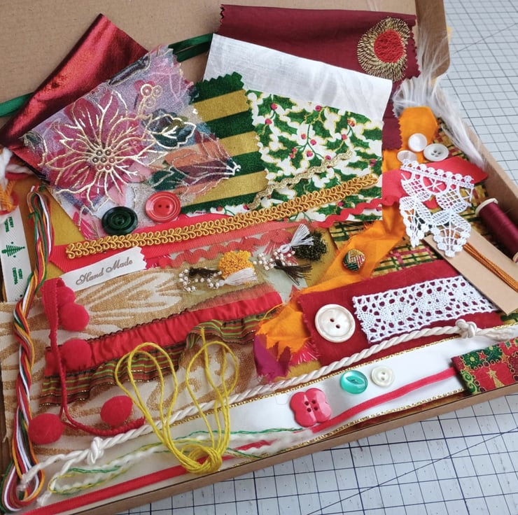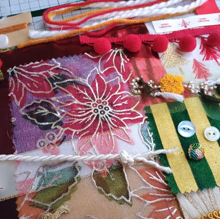 Glittery Christmas - my sparkly poinsettia inspiration bundle is full of vintage, pre-loved and factory waste textiles, haberdashery and trims in red, gold, green and white. Ideal for making small craft projects, as well as slow stitching and textile art.