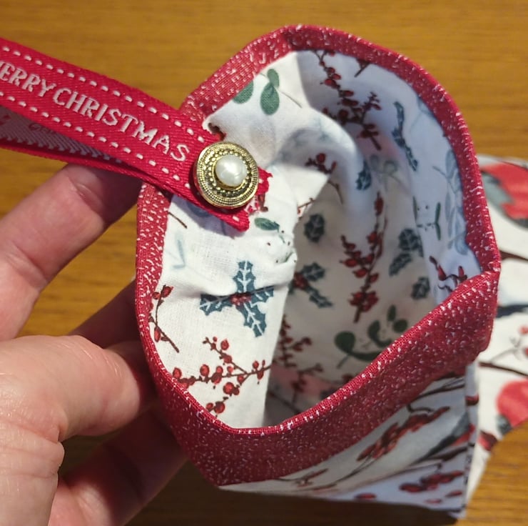 The stocking is hung by red ribbon saying "Merry Christmas" which is attached to the inside with a shiny button.