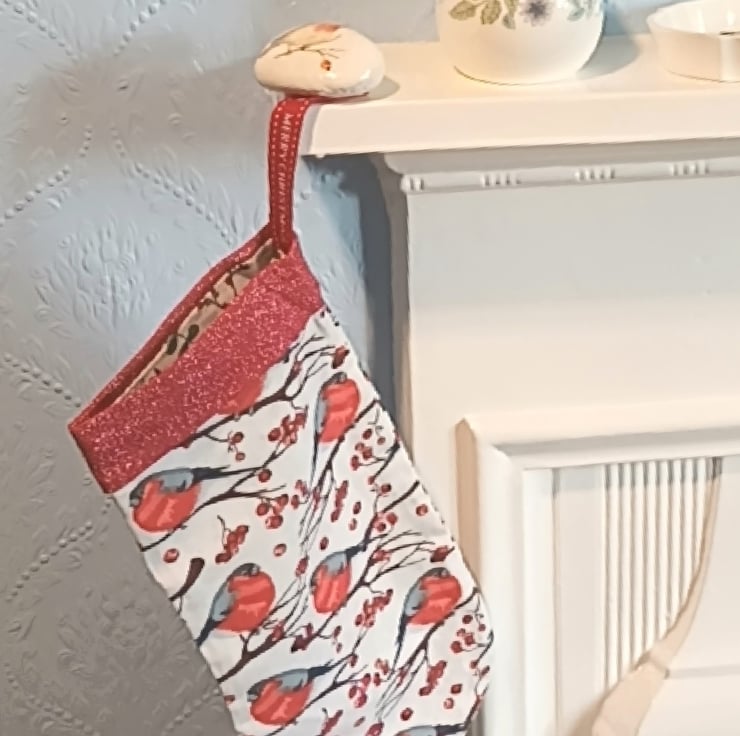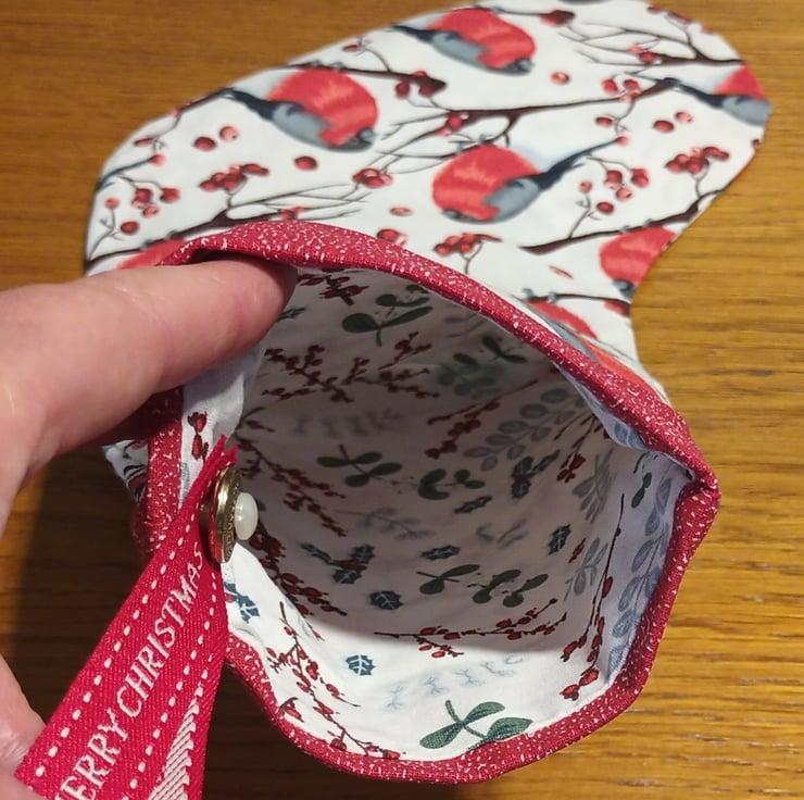 A cotton fabric stocking, featuring bullfinches on the outside and winter foliage on the lining, trimmed with red fabric.