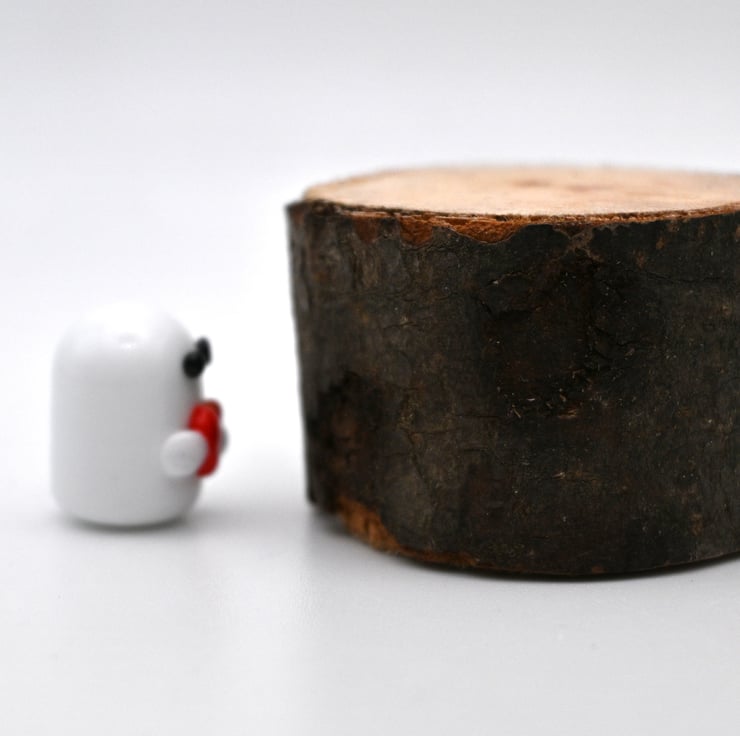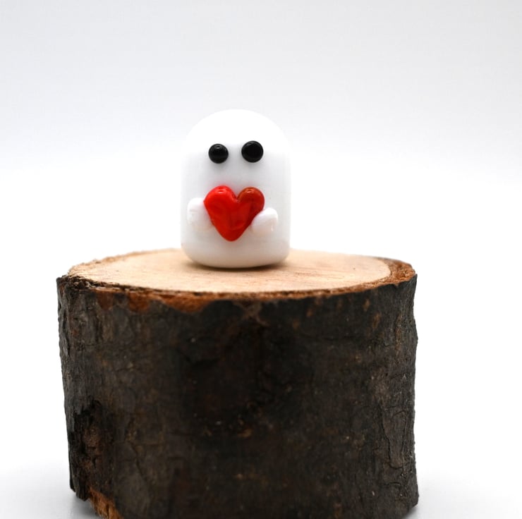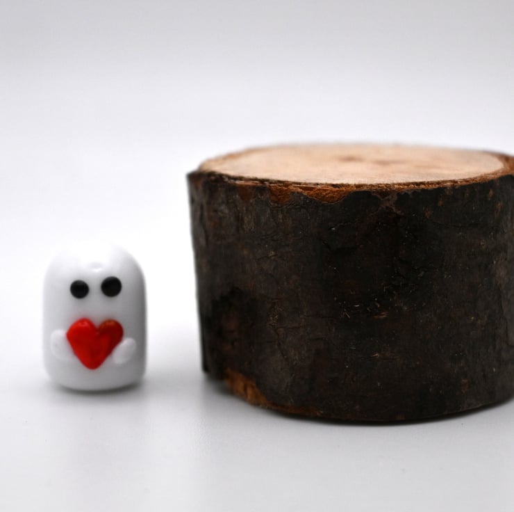 A small glass ghost figure made by hand using a technique called lampworking.