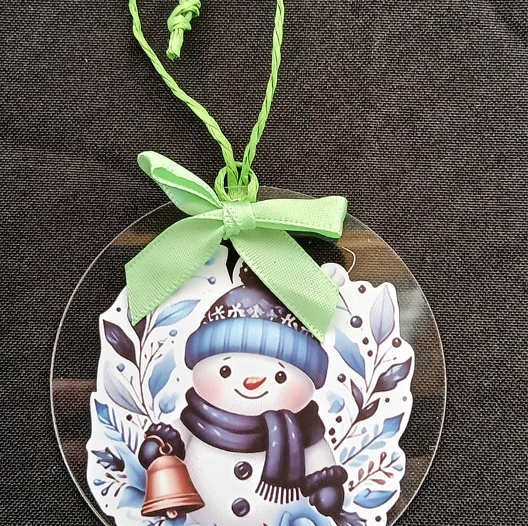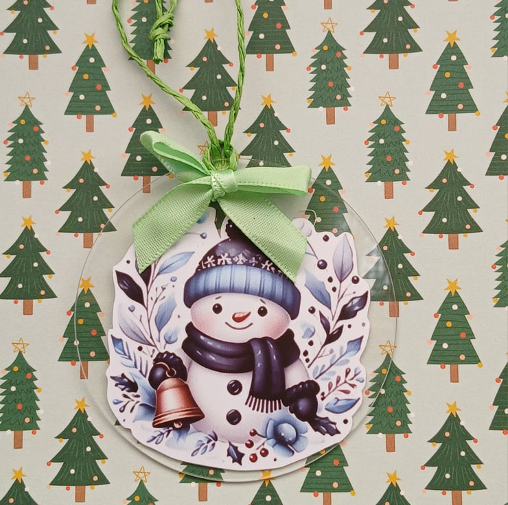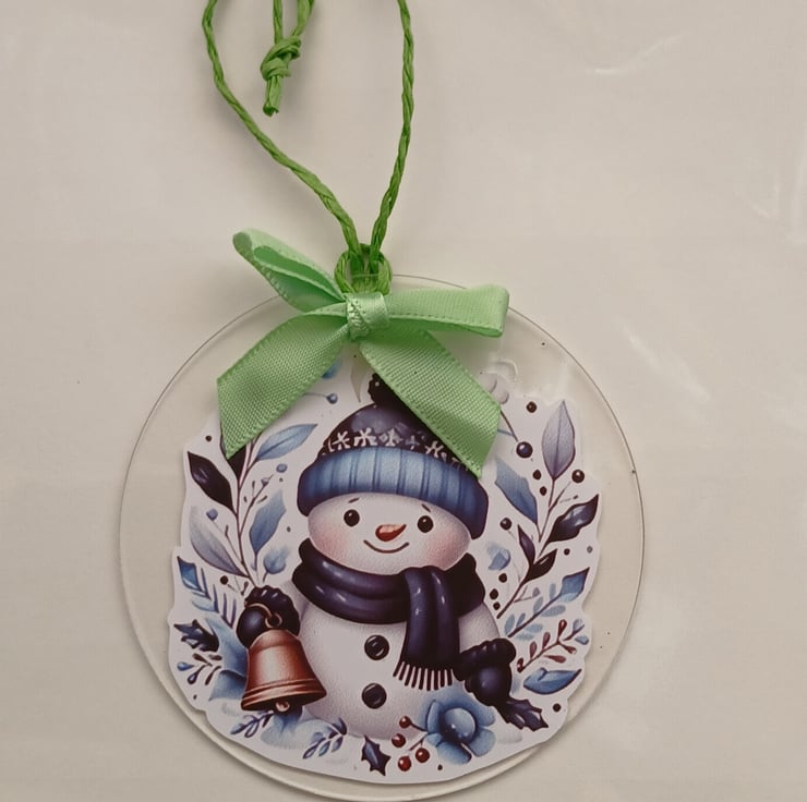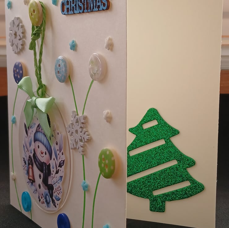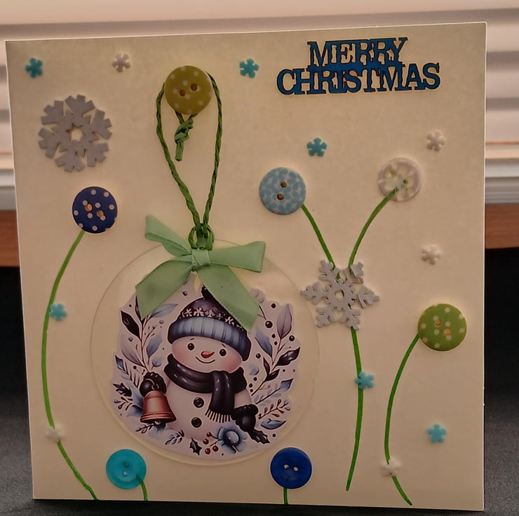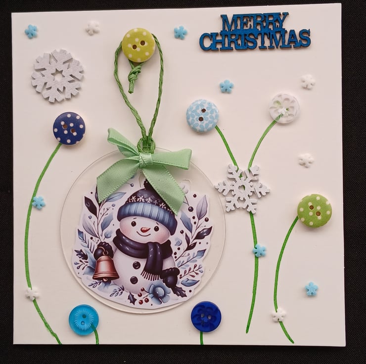 Handmade Christmas Card, incorporating a clear acrylic, snowman design, Christmas decoration.