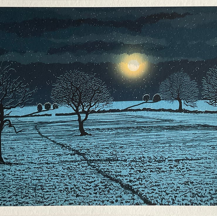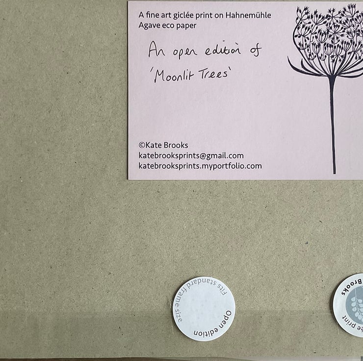 A fine art giclee print on Hahnemuhle Agave eco paper called 'Moonlit Trees'. It is A4 and is signed and titled.