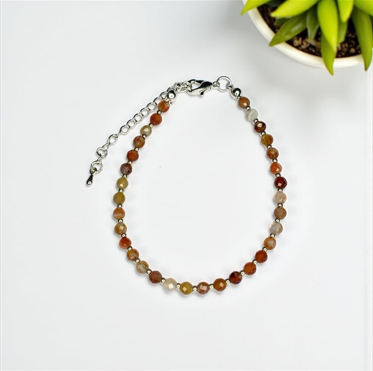 Dainty handmade bracelet featuring 4mm faceted Carnelian gemstone beads, beautifully complemented by silver glass seed beads. This 7-inch bracelet symbolizes warmth, vibrancy, and courage, making it the perfect companion for those seeking strength and creativity. Fastened with a secure silver-plated lobster clasp and an extender chain for a comfortable fit, it arrives elegantly wrapped in tissue and an organza bag.