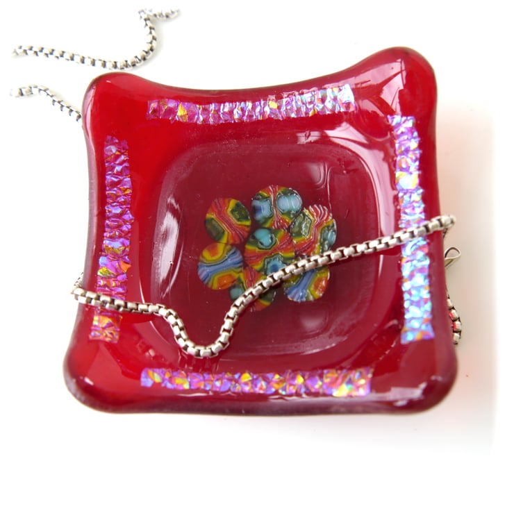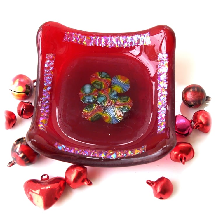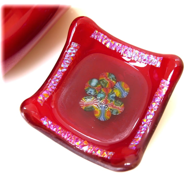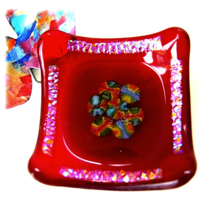 This little dish is on a base of bright red glass topped with a different red centre in which I have encased pretty millefiori sices. I've added side borders of textured dichroic glass.