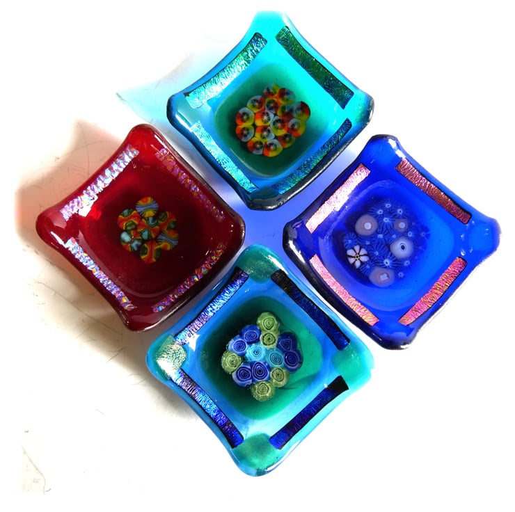 A 7cm square dish, twice fired in my kiln, first to fuse all the glass together, 2nd to slump it over a little mould to make a deep little dish.