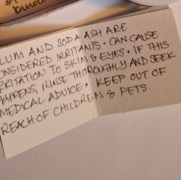 The ingredients - Alum (potassium aluminium sulfate), Soda Ash (Sodium Carbonate), Calcium Carbonate, Seashells, Eggshells, Gum Arabic, Aqua Art Matt Binder, Water, Salt, Sloes (non-toxic)
