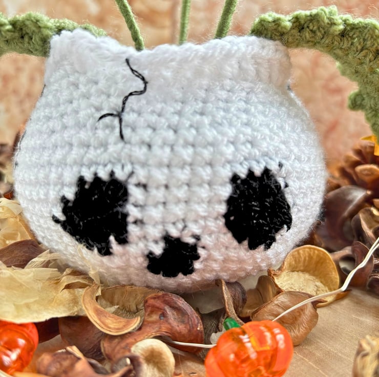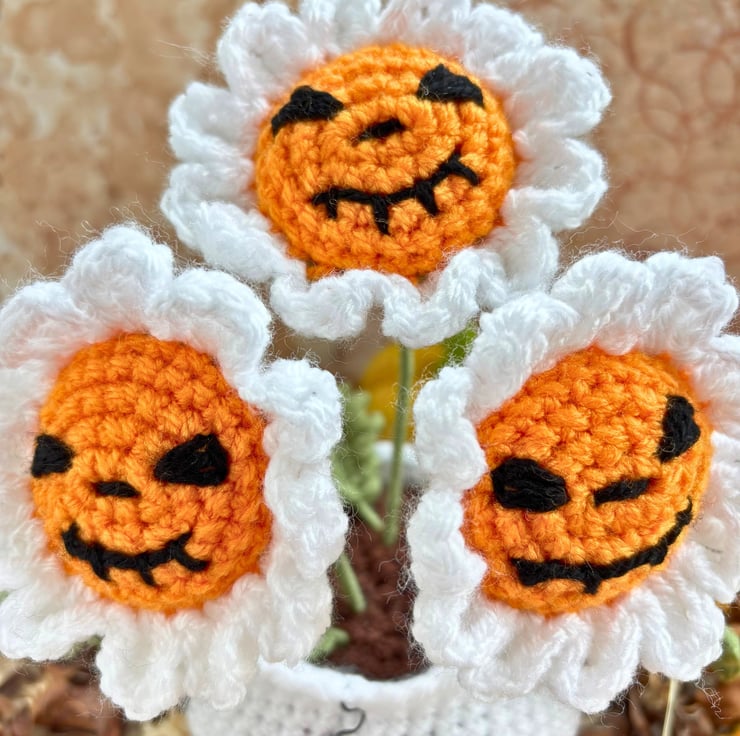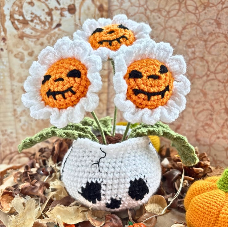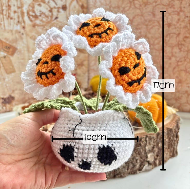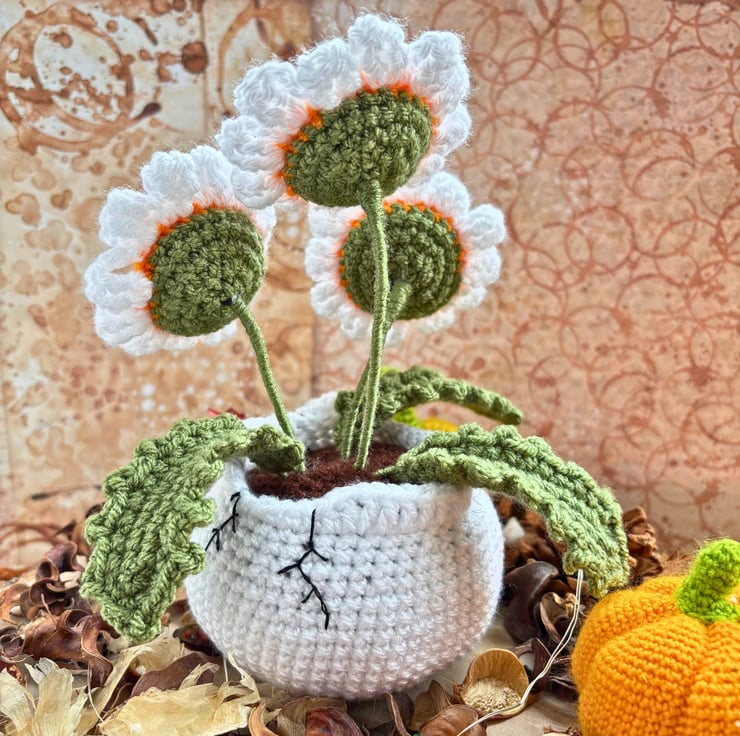 This amigurumi decoration consists of a white skull pot filled with a brown ball representing the soil, 3 daisies and 3 leaves. All crocheted with 100% premium acrylic yarn. Black thread has been used to embroider the cracks on the pot, while the eyes, nose & mouth on the daisies have been sewn on with black yarn. Both the ball of soil & the flower centres are filled with 100% Hi-Loft Polyester Filling. The daisies and leaves can be carefully bent to a different position as they contain craft wire.