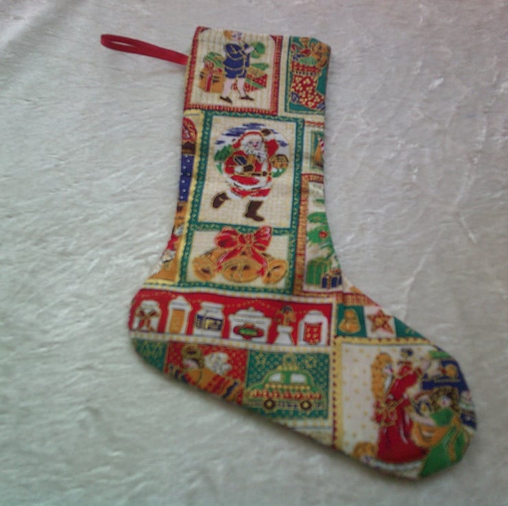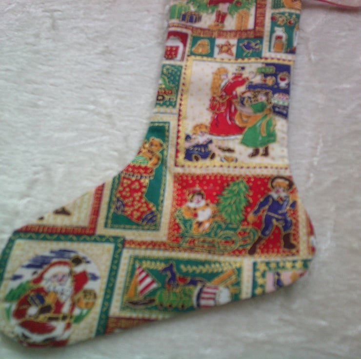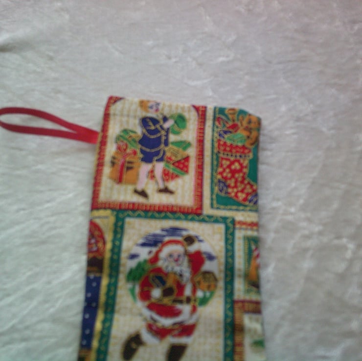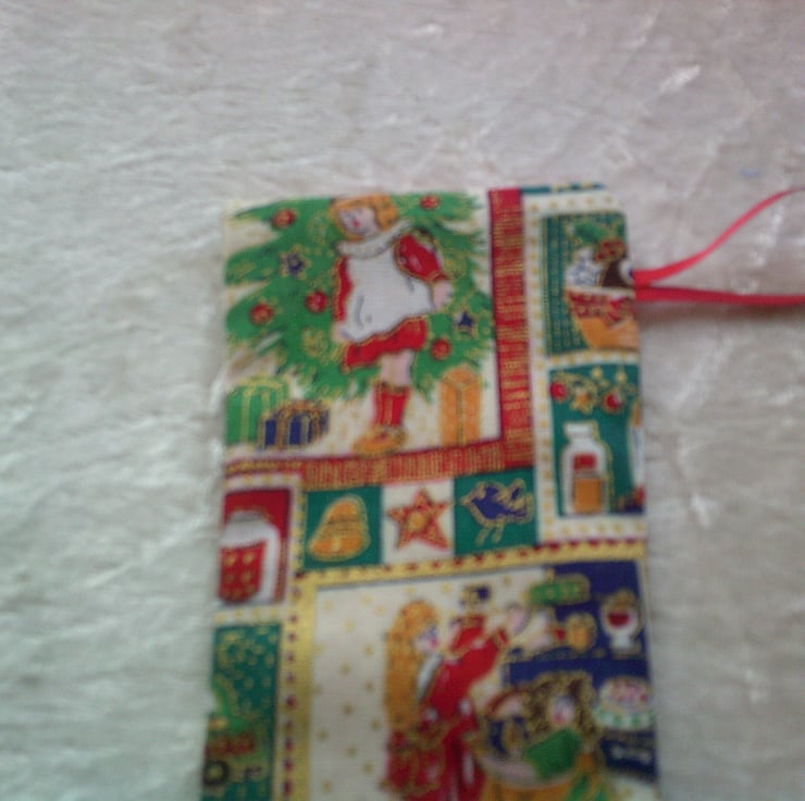 The fabric used is of Christmas themed squares including Santa, Trees, bells, children and gifts on a cream background and is fully lined with red cotton fabric.