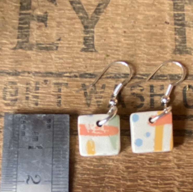 These earrings have been made from white earthenware clay and are imprinted with an abstract design. They have then been fired once, glazed in a bright, shiny glaze on the front and back and then fired in the kiln for a second time. They hang from silver 925 ear wires.They measure 1cm square. They will come presented in a small organza pouch and shipped in a sturdy, large letter shipping box.