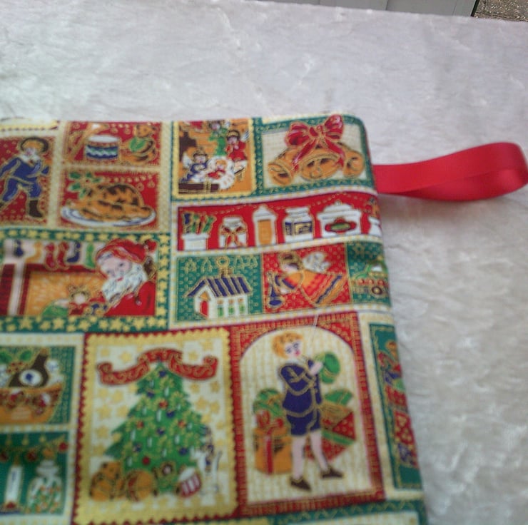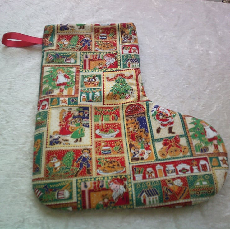 This Christmas Stocking features a Squares with Christmas Themes including Christmas Trees, Gifts, Bells, Father Christmas and Children on a Cream background. The design is the same on both sides so it can be hung up either way round and either be used for small gifts or just as a decoration. It could also be used to hold a Secret Santa Gift.