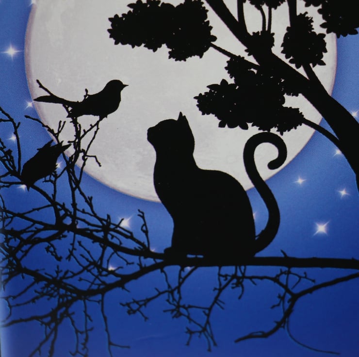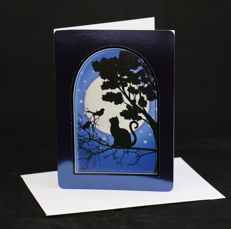 From my Fantasy range, a scene of a black cat sitting on a branch gazing at two birds, silhouetted by a large moon and twinkling stars in the background.