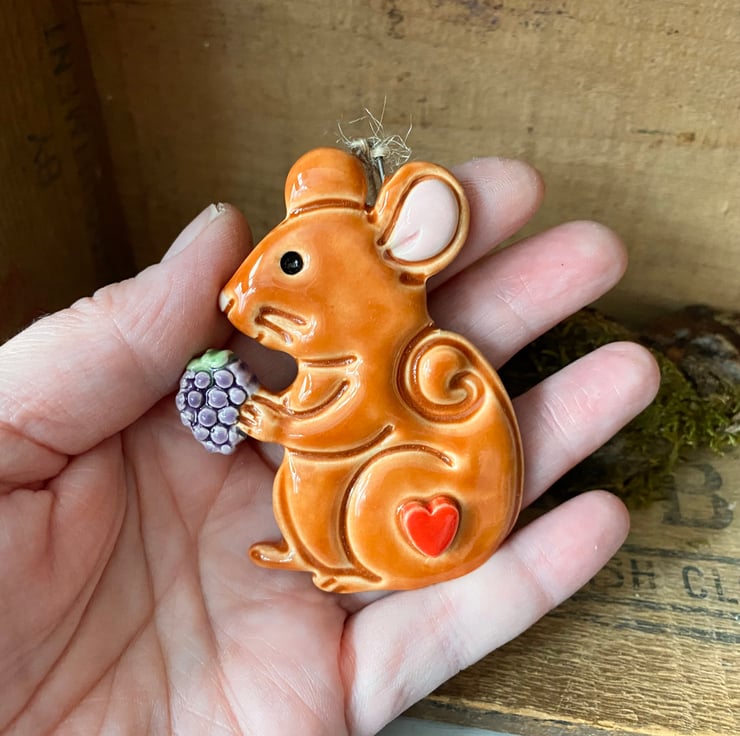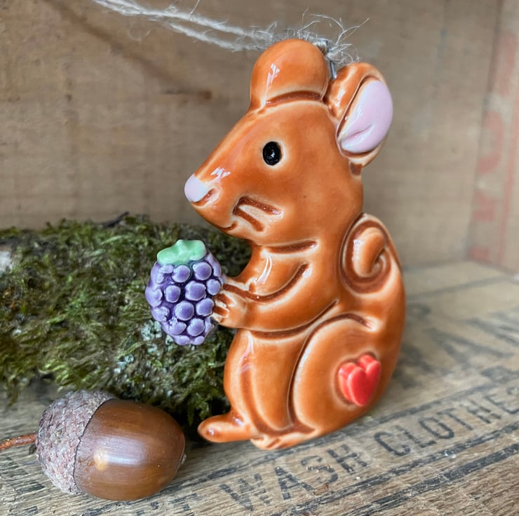 This sweet little ceramic mouse is chomping down on a juicy blackberry. He has been totally hand designed by me from start to finish. Made from white earthenware clay and finished with a red heart. It has been fired twice and finished with bright glossy ceramic glazes. Glazed on the front only. It measures 7cm x 6cm x 1cm deep and hangs from a brown string.