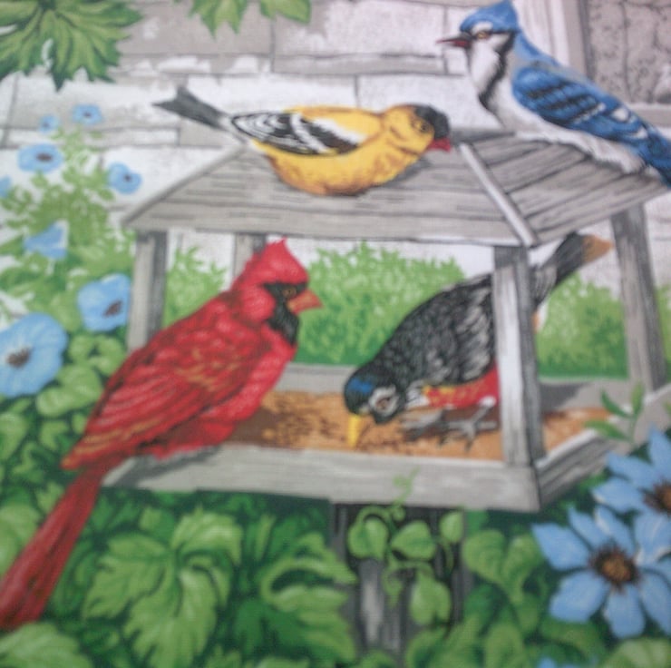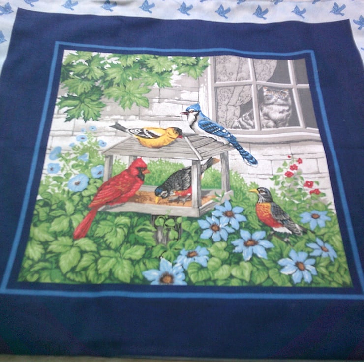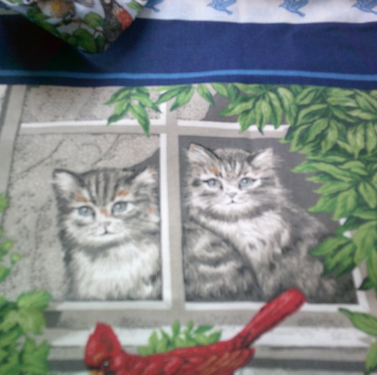 This Eco Friendly, fabric bag is made using 100% Cotton panels with cats in the window watching the birds on the Bird Table on one side and on the other they are watching them on the birdbath.