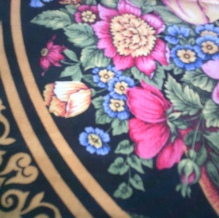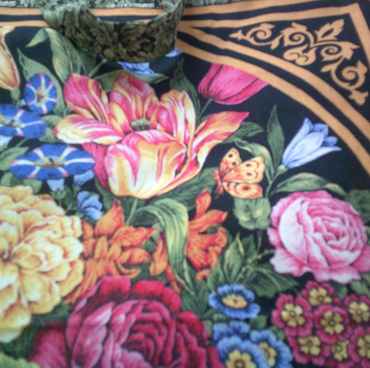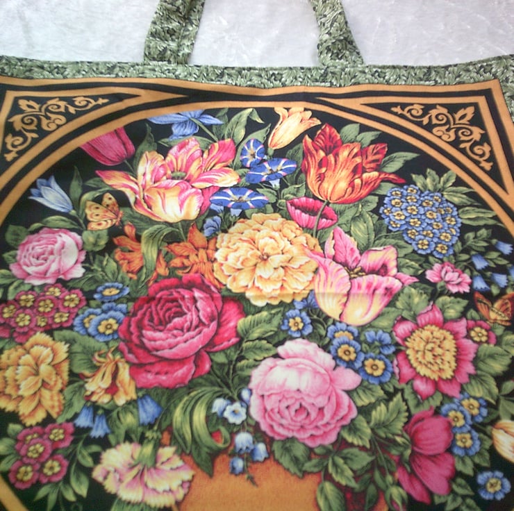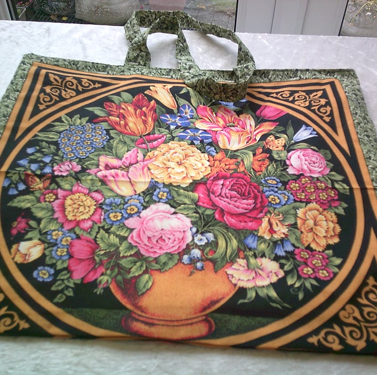 This Eco Friendly, fabric bag is made using 100% Cotton panels with pictures of a bowl of spring flowers including Peonies, Roses and Tulips on a black background. Both sides of the bag are the same.
