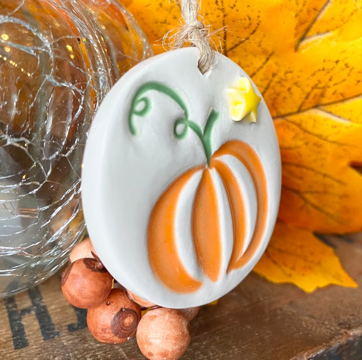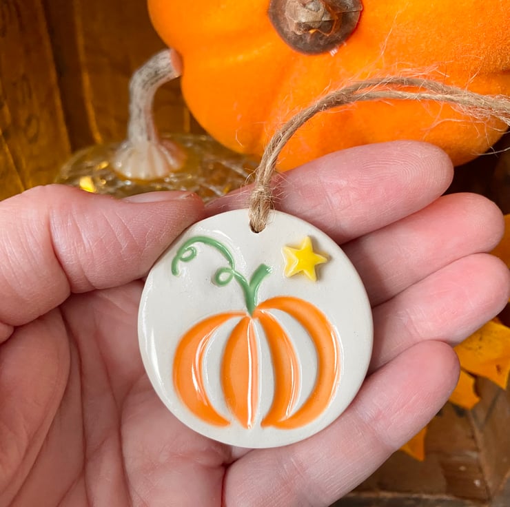 This little pumpkin decoration has been made from white earthenware clay and finished with a tiny little star. It has been fired twice and finished with bright glossy ceramic glazes. Glazed on the front only. It measures 4.5cm diameter x 0.5cm deep and hangs from a brown string.