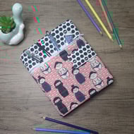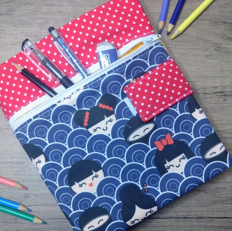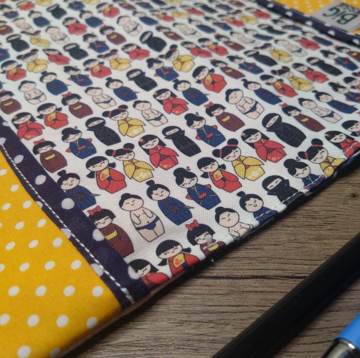 This A5 sized sketchbook cover features my kokeshi doll themed fabric patterns. The cover will fit a wire bound sketchbook with 80 pages and is reusable, simply fill with a new sketchbook when needed. I have also designed the cover to include a built in pencil case on the front to store sketching and writing pens/pencils. This makes it handy for when you're out and about.