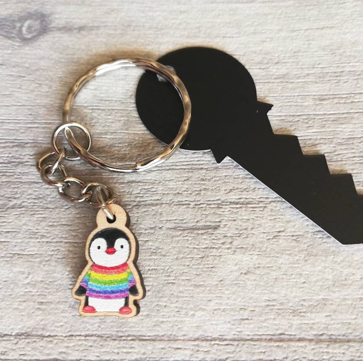A little wooden penguin, in a rainbow jumper, key chain.