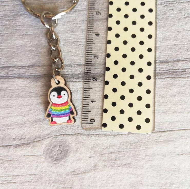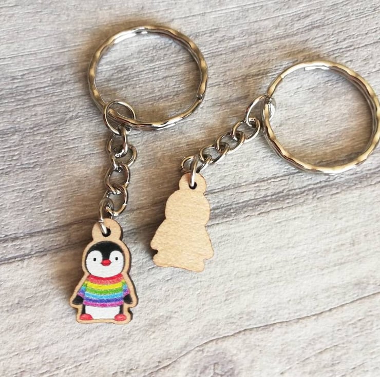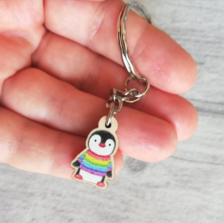 Little Rainbow Jumper Wooden Penguin Keyring
