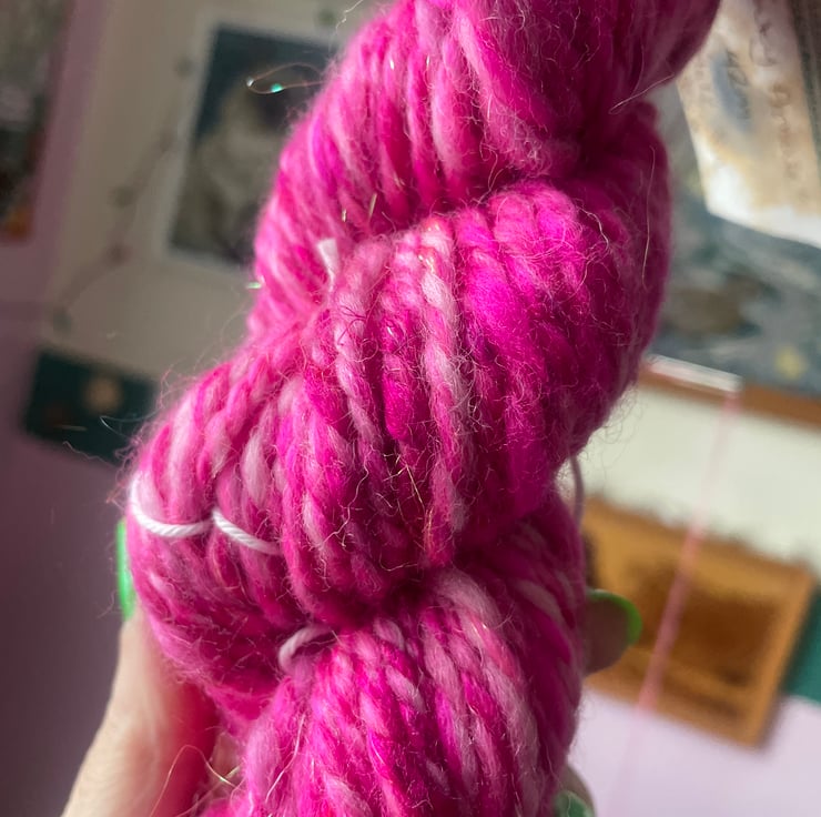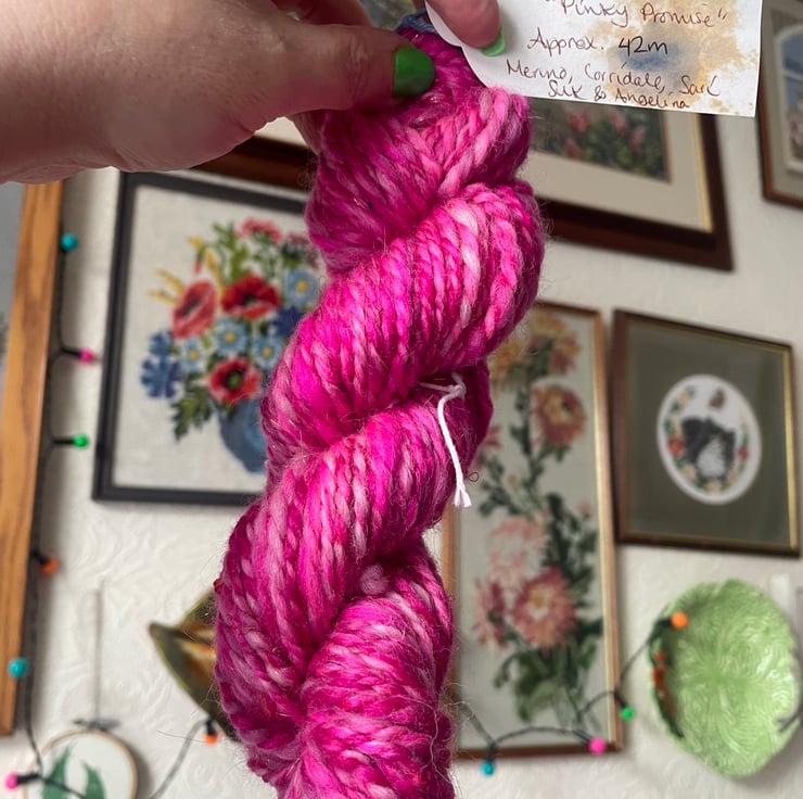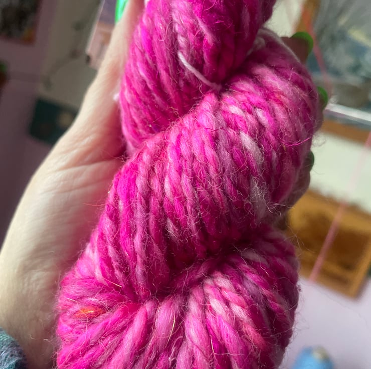 Colours are blended on a classic carder and then the yarn is spun on an Ashford traditional spinning wheel. All made by hand, this art yarn is perfect for your next project. That might be knitting, crochet, weaving, embroidery or felting! The only limit is your imagination!! If you're stuck for ideas, find me on Tiktok/insta where I regularly post projects I have completed using my handspun yarn.