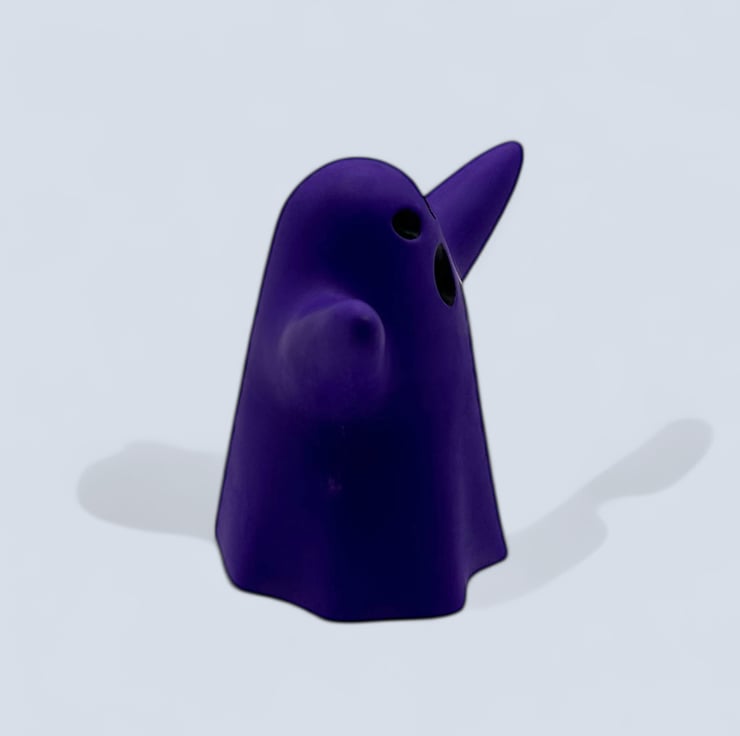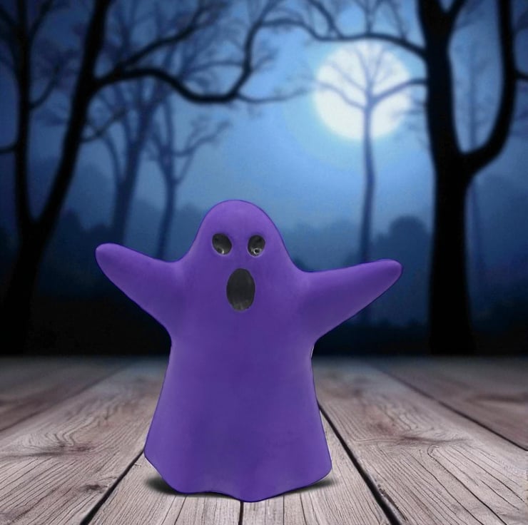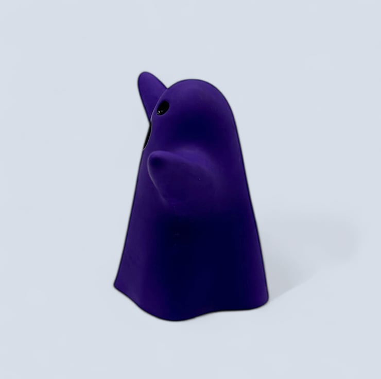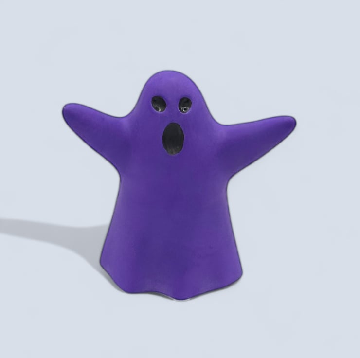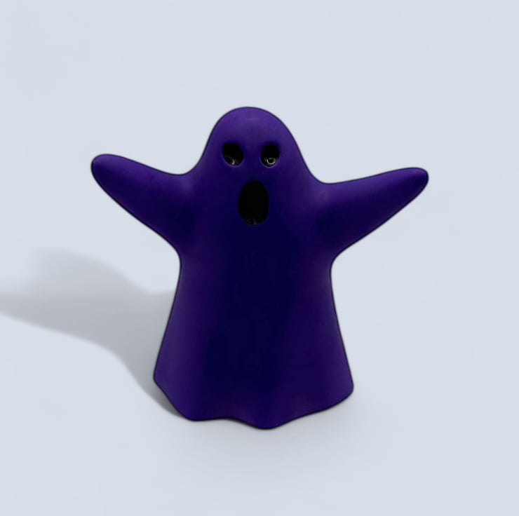 This ghost comes from a mould with arms lifted high, giving it an animated, expressive character. I pour the plaster in and let the mould capture every curve, then once it sets, I paint in the eyes and mouth to bring it to life. The deep purple colour feels mysterious and bold, like a spirit caught between shadows and midnight skies. Each pour comes out slightly different, so no two ghosts are ever identical. For me, this design is about keeping Halloween playful and full of drama, a handmade spirit that refuses to fade quietly into the background