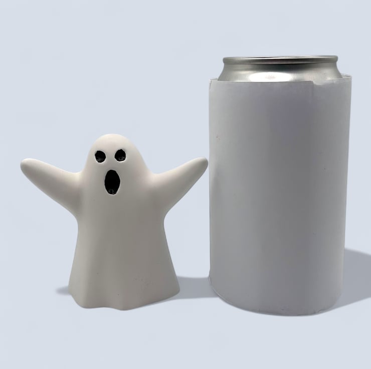 Each ghost is made by pouring Crystacast plaster into a mould, producing a smooth stone like finish and a substantial weight. Once set, the details are finished with hand painted eyes and mouth using black acrylic paint. Approximate dimensions are 8 cm in height, 6 cm in length and 9 cm in width. For scale reference, one of the listing photos shows the same design in white placed next to a standard drinks can.
