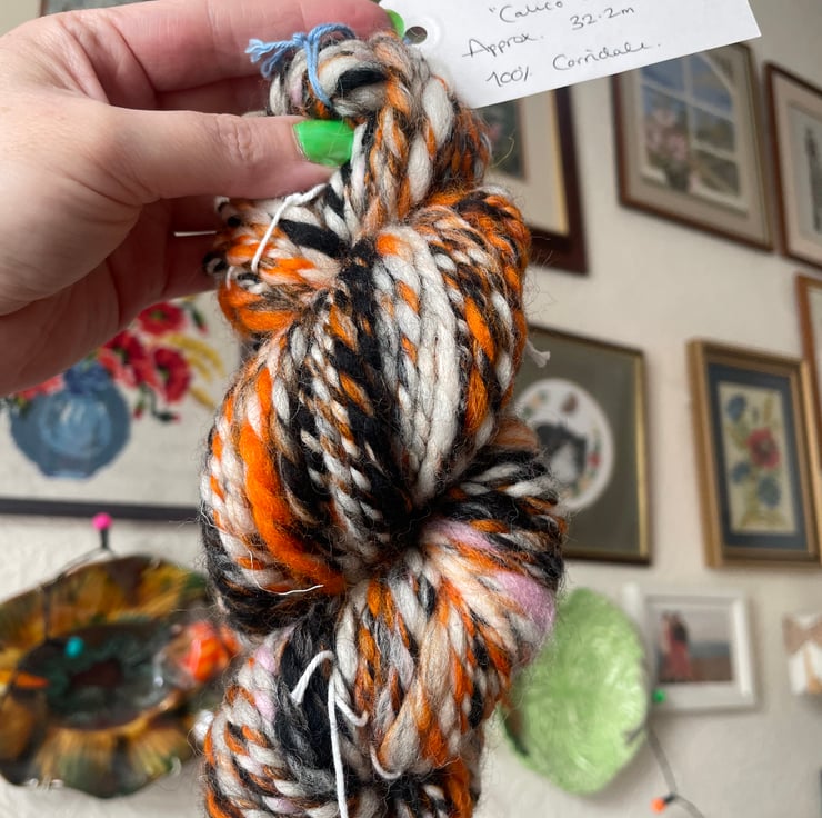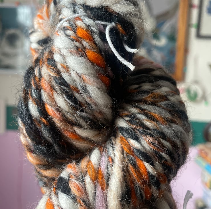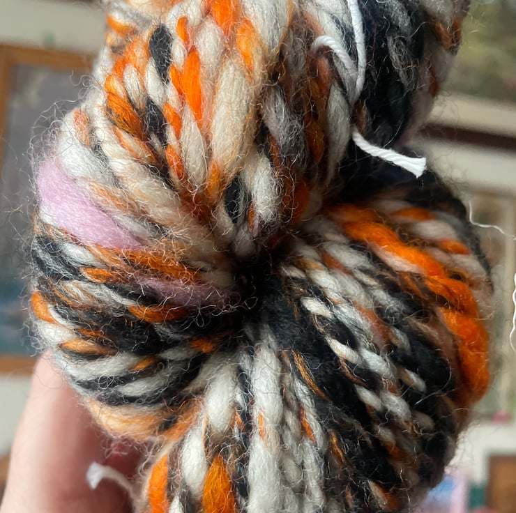 Colours are blended on a classic carder and then the yarn is spun on an Ashford traditional spinning wheel. All made by hand, this art yarn is perfect for your next project. That might be knitting, crochet, weaving, embroidery or felting! The only limit is your imagination!! If you're stuck for ideas, find me on Tiktok/insta where I regularly post projects I have completed using my handspun yarn.