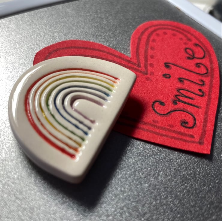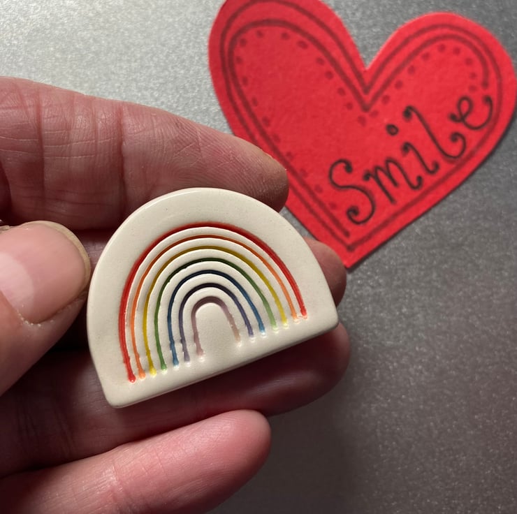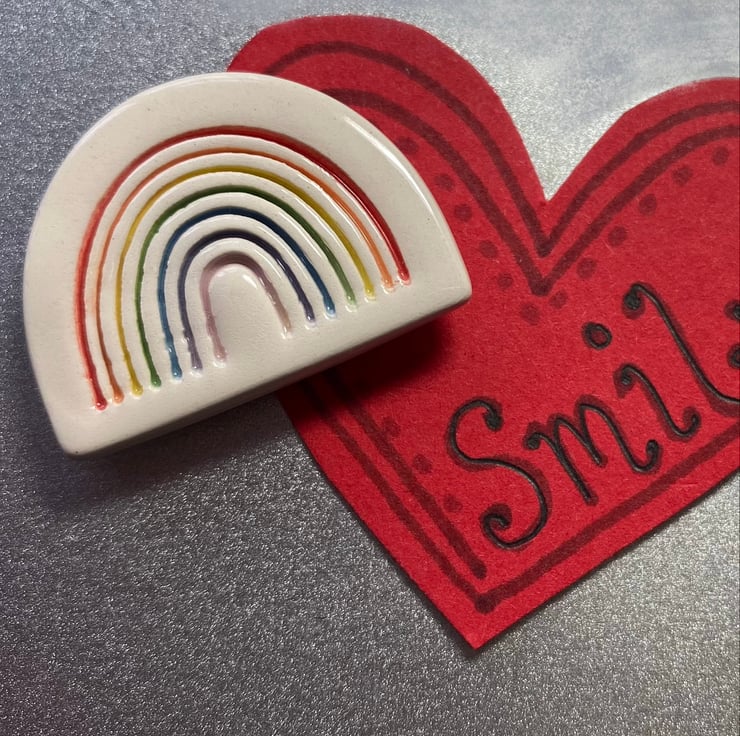 This listing is for a ceramic rainbow magnet made from white earthenware clay. It has a magnet glued to the back. It has been fired once to the bisque stage and then a second firing for the glaze. It measures approx 3.5 x 2.4cm x 3mm deep.