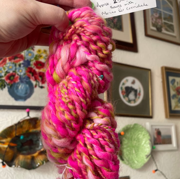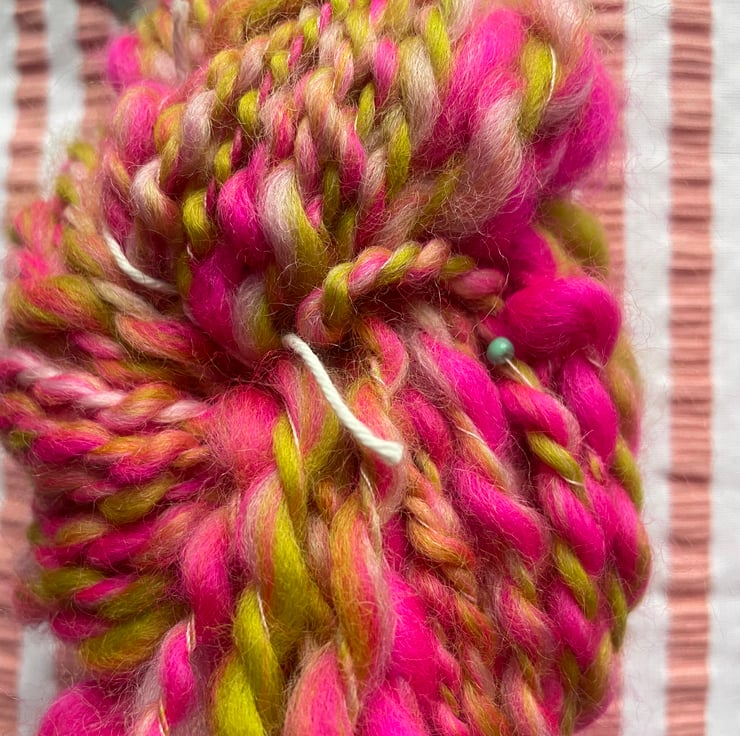 Colours are blended on a classic carder and then the yarn is spun on an Ashford traditional spinning wheel. All made by hand, this art yarn is perfect for your next project. That might be knitting, crochet, weaving, embroidery or felting! The only limit is your imagination!! If you're stuck for ideas, find me on Tiktok/insta where I regularly post projects I have completed using my handspun yarn.