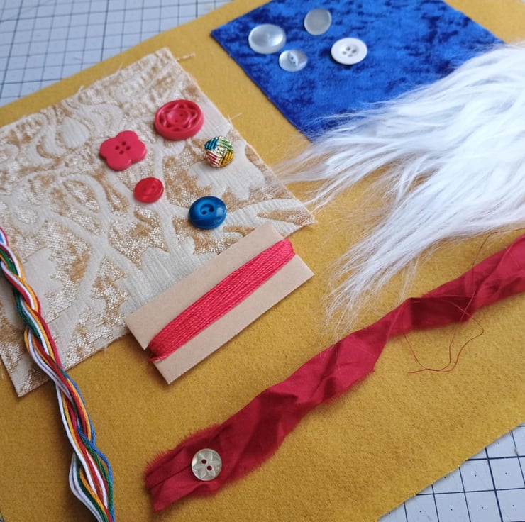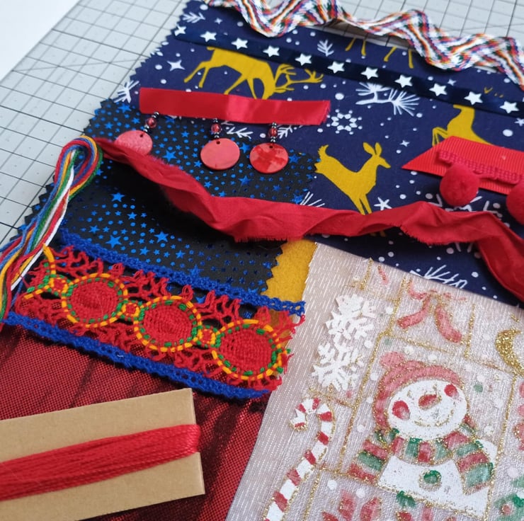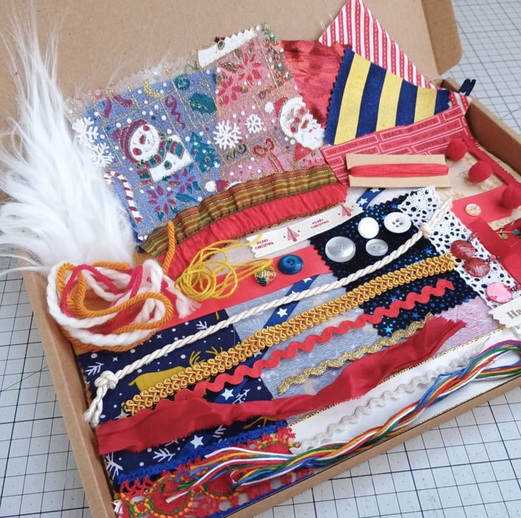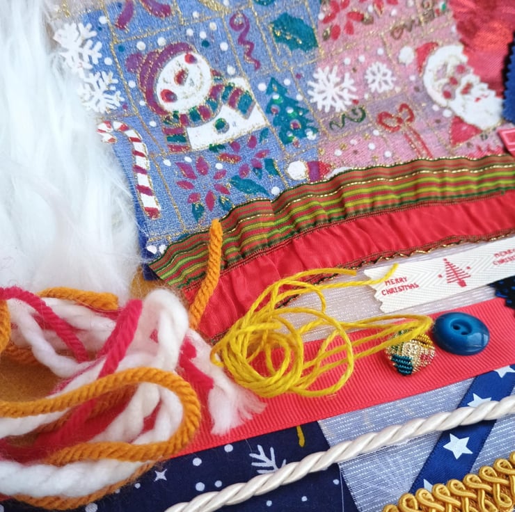 Sparkly Christmas - my glitter Snowman and Santa inspiration bundle is full of vintage, pre-loved and factory waste textiles, haberdashery and trims in blue, white, gold and red. Ideal for making Christmas decorations and small craft projects, as well as slow stitching and textile art.