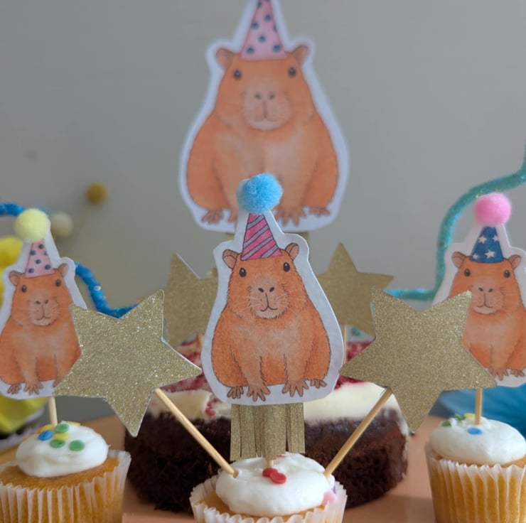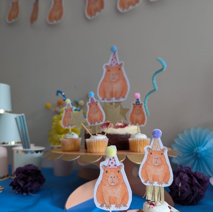 I drew and painted each Capybara myself and then scanned in to print the Capybaras out digitally onto 300gsm hammered card to create the cake toppers. Each Capybara also features very cute pastel coloured pom poms which decorate the top of their party hats, and gold tassels on two of the Capybaras created using vinyl.