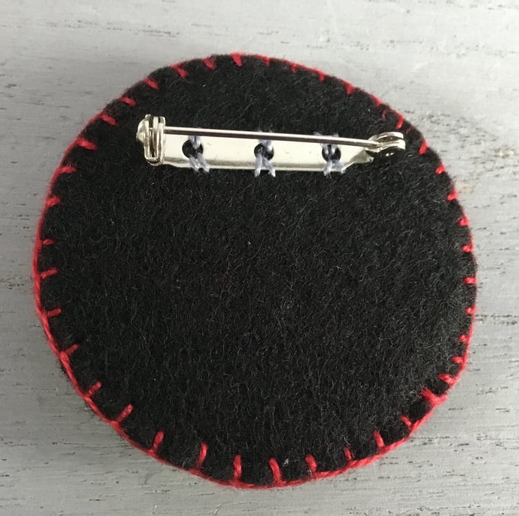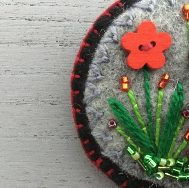 This Hand Embroidered Winter Cat Brooch has a story to tell……a Black Cat wearing her red scarf is getting wrapped up warm for winter. This Black Cat button is sewn onto circles of grey and black felt. She sits beside a red Flower button, red beads and hand embroidered leaves and stems in green embroidery threads. The brooch is edged in Blanket Stitches embroidered in red embroidery thread.