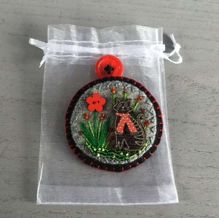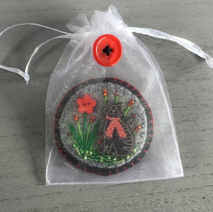 This Hand Embroidered Winter Cat Brooch is gift wrapped in an organza bag, decorated with a red button. It’s ready for a birthday, thank you, friendship or Christmas gift……it’s light to post for a letterbox gift.