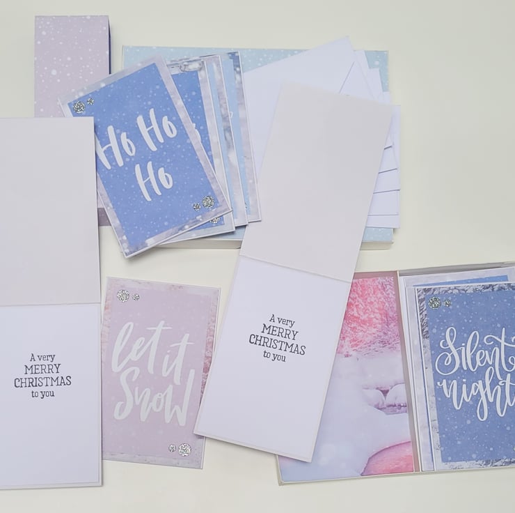 Each card features a bold white festive sentiment (5 sentiments, 2 of each), and contains a stamped sentiment on the lined interior which reads "A very Merry Christmas to you"