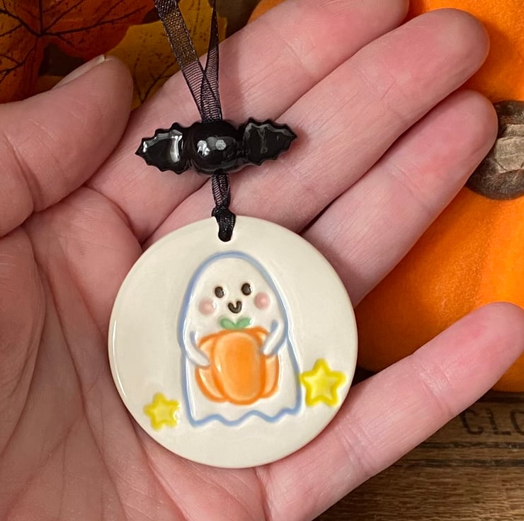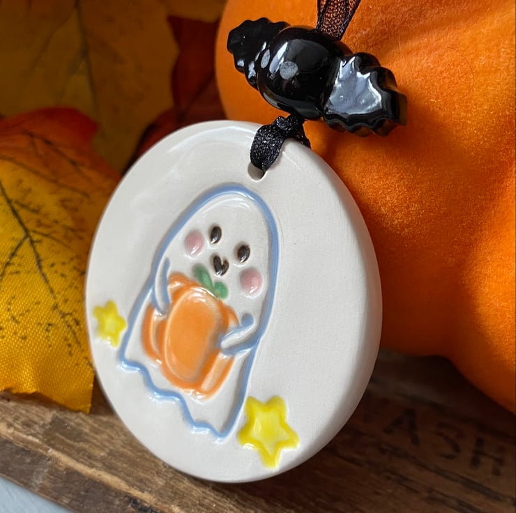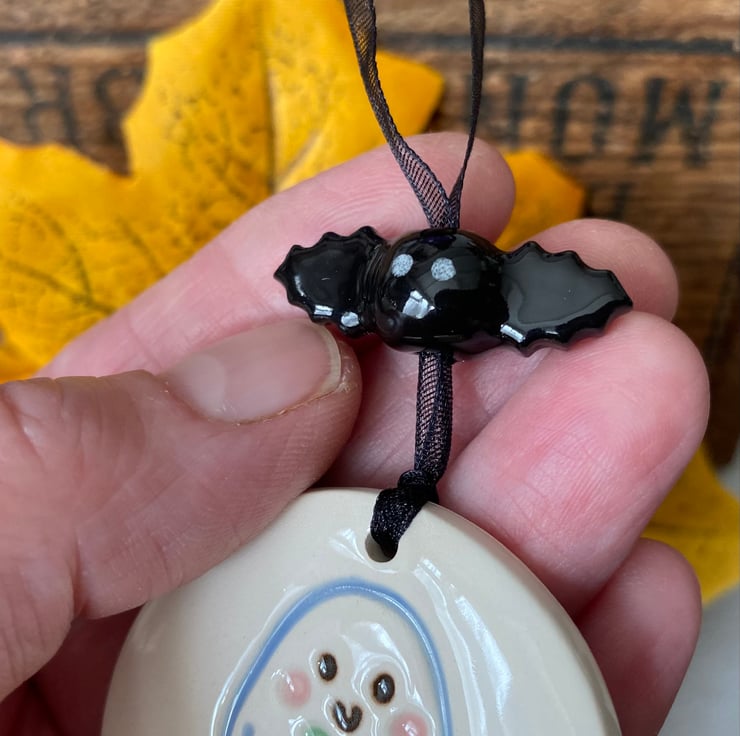 This really cute little ghost decoration has been made from white earthenware clay and finished with bright glazes. It is topped with a tiny little bat shaped bead that has been hand modelled. Including the bead it measures 5.5 cm x 4 cm x 1 cm deep and hangs from a black organza ribbon