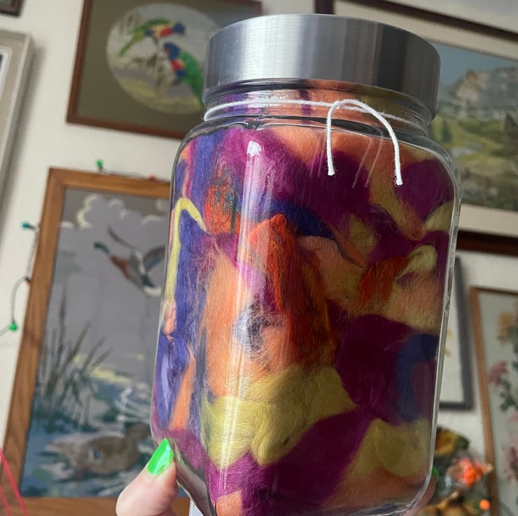 Due to the perils of sending a glass jar through the post, and the upset I would feel when the courier inevitably smashes one, all fibre will be decanted into a recyclable cardboard box for postage. Wash out and recycle one of your own glass jars if you would like to display your fibres prior to spinning :)