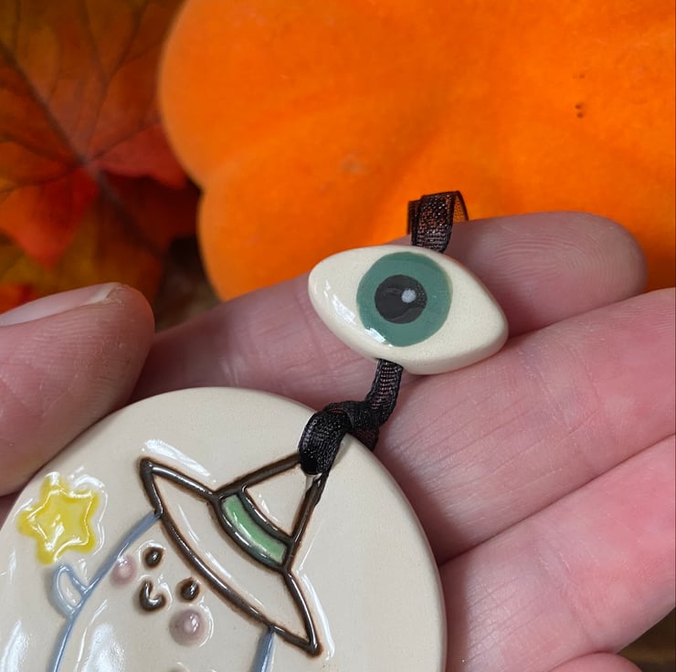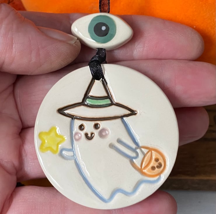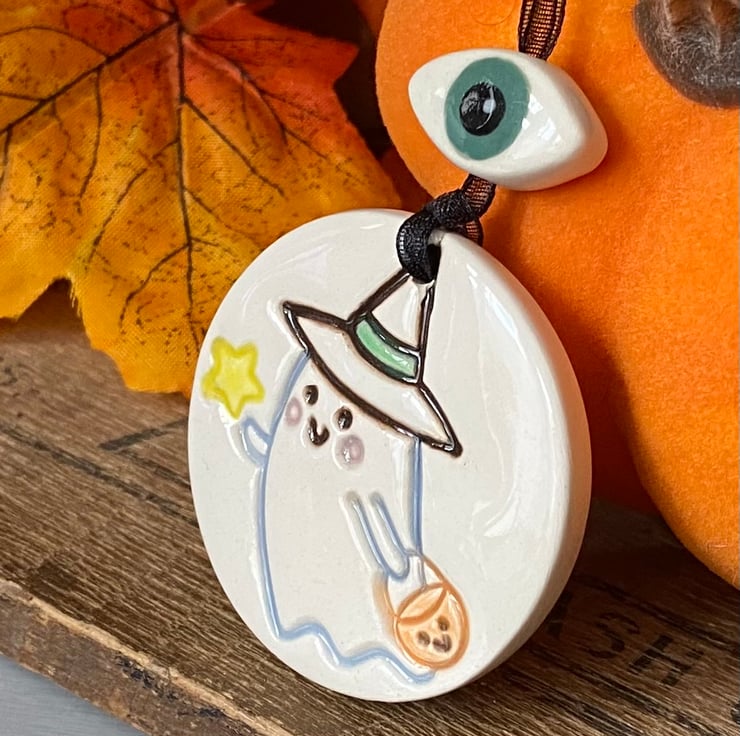 This really cute little ghost decoration has been made from white earthenware clay and finished with bright glazes. It is topped with a tiny little eyeball shaped bead that has been hand modelled. Including the bead it measures 5.5 cm x 4 cm x 1 cm deep and hangs from a black organza ribbon
