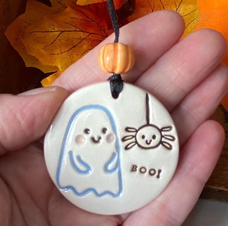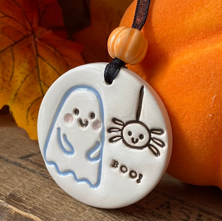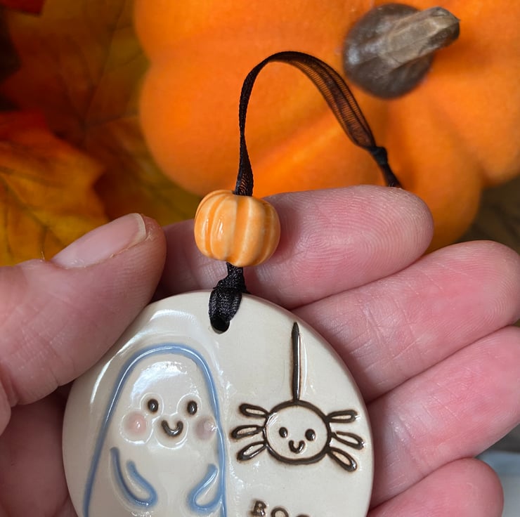 This really cute little ghost decoration has been made from white earthenware clay and finished with bright glazes. It is topped with a tiny little pumpkin shaped bead that has been hand modelled. Including the bead it measures 5.5 cm x 4 cm x 1 cm deep and hangs from a black organza ribbon