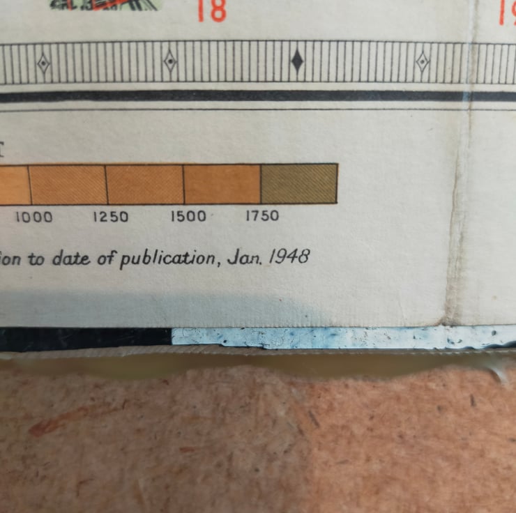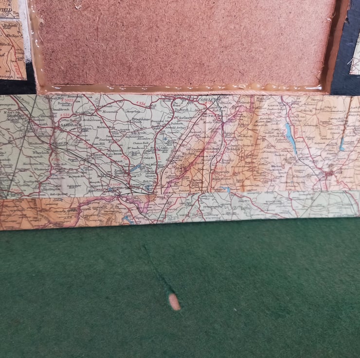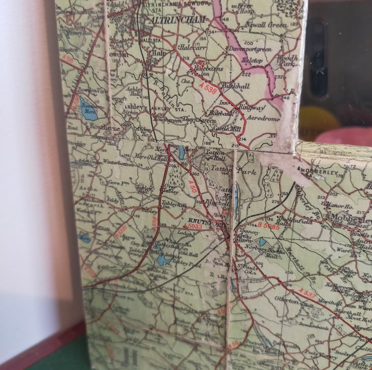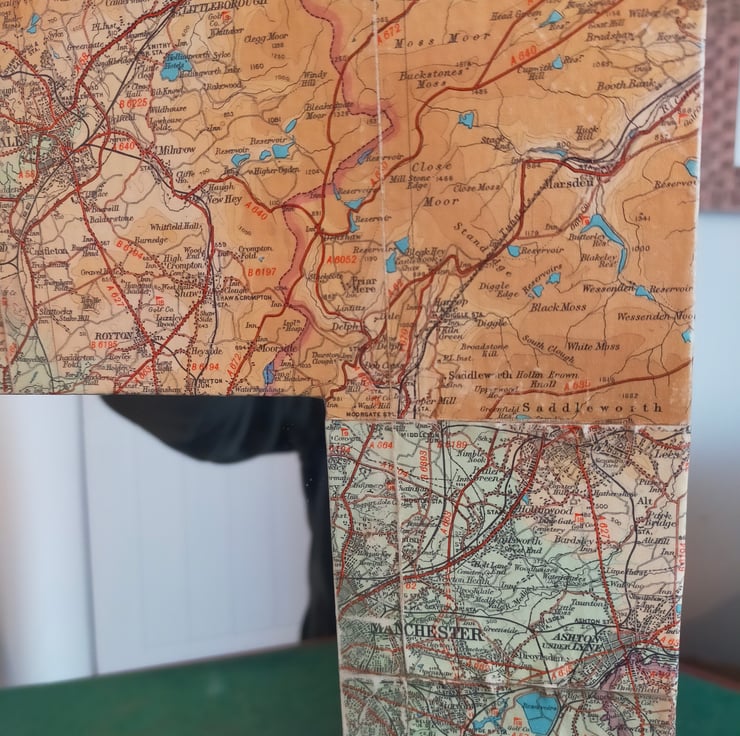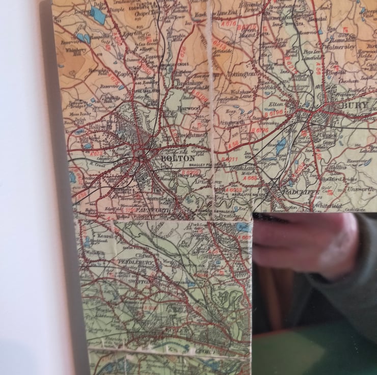 I have glued a vintage 1948 Bartholomew map (far more colourful than their OS counterparts) onto a reclaimed pine frame in four sections, with the Lancashire and Cheshire elements being at the top and bottom. A piece of mirror glass has been cut to size and glued in with a hardboard backing. The central part of the map has been split so that Manchester lies to the right and Salford to the left. The whole has had a light protective varnish, although the original folds and wear marks can still be discerned. This would make a wonderful gift for someone proud of their Mancunian heritage and is a great talking point as it shows how the area has changed in nearly 80 years.