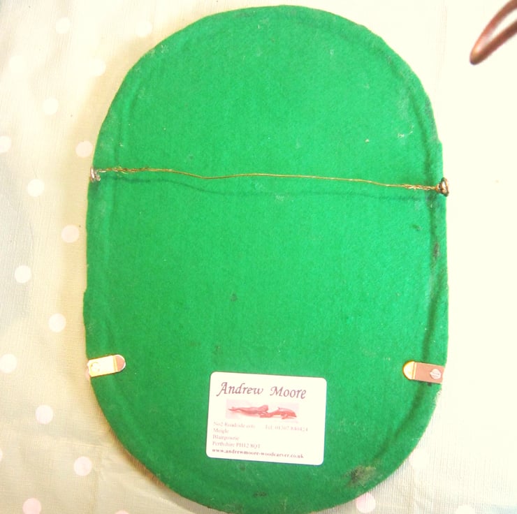 It is backed with green felt , with loops and picture wire to hang it by. ( ready fixed ).