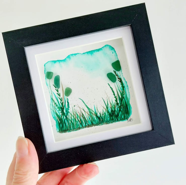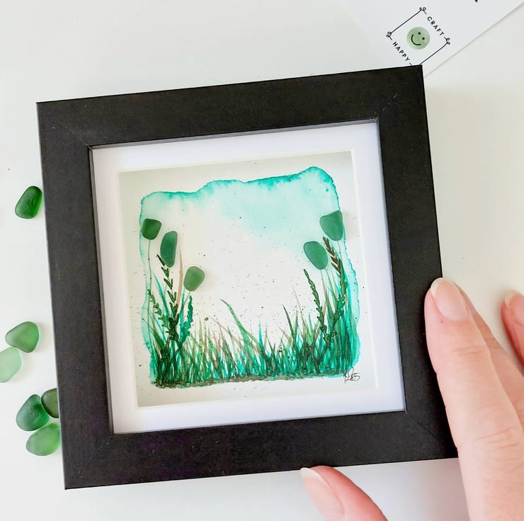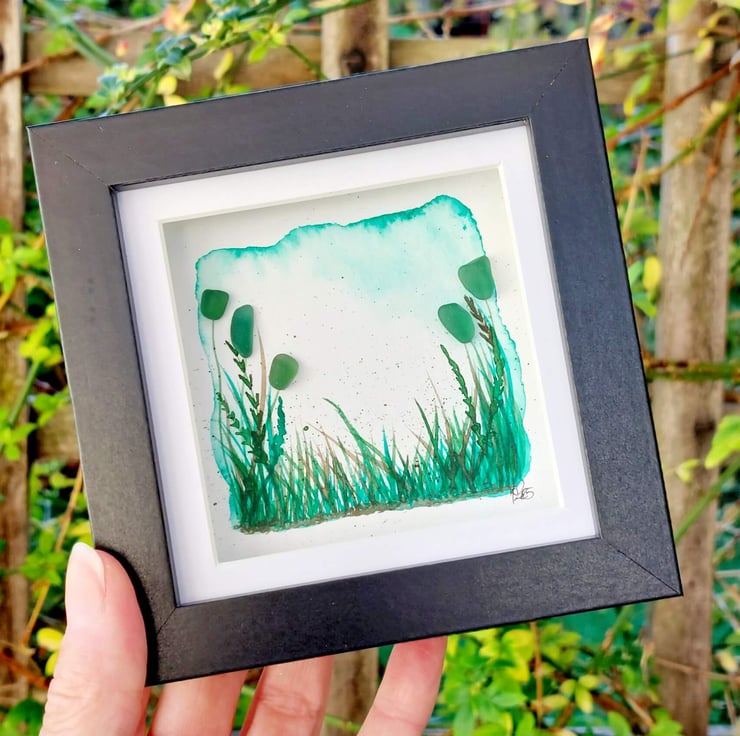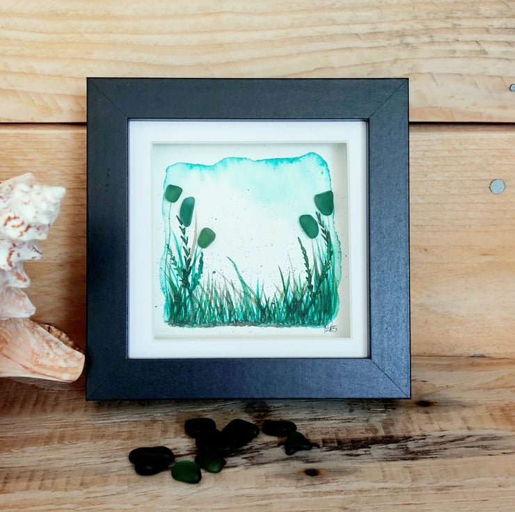 - This original artwork has been framed using a 12cm black frame and mount. It is simple, elegant and makes use of beautiful, perfectly tumbled sea glass from Seaham.