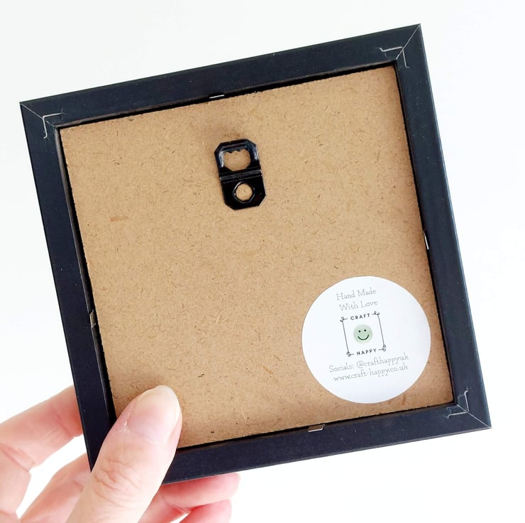 - The frame is 12cm square in black and has a mount. The aperture of the picture is 9cm and there is a hook on the reverse so you can hang it on the wall.