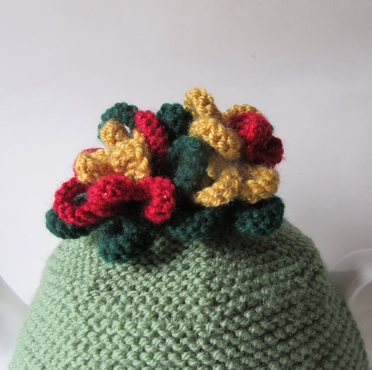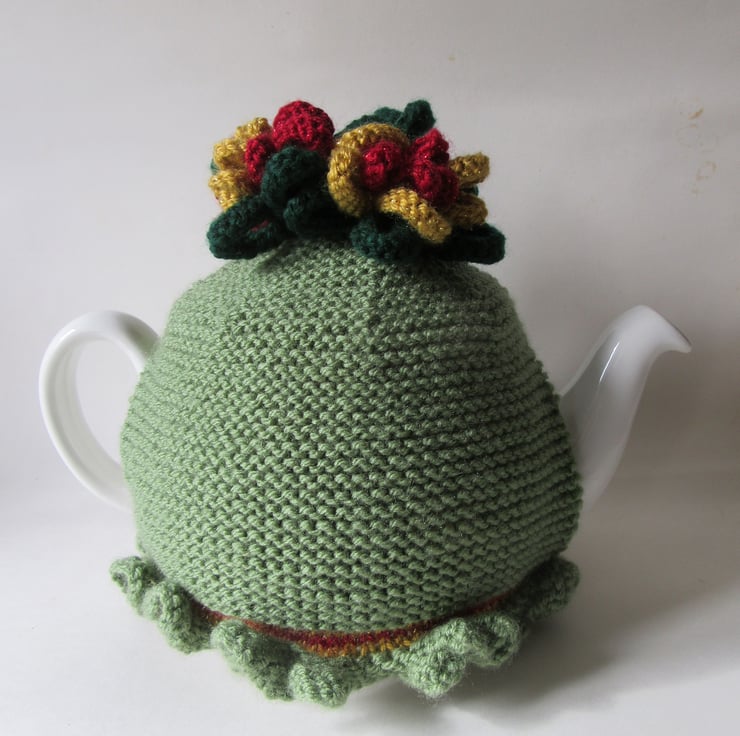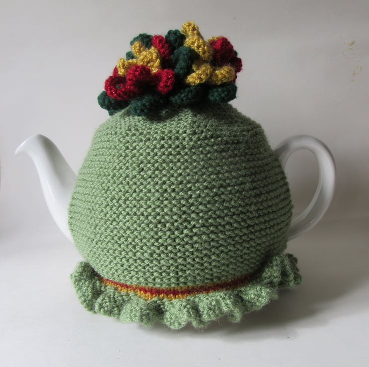 A hand knitted Christmas tea pot cosie using traditional seasonal coloured yarn. The body is knitted in a leaf green coloured yarn, using garter stitch for thickness and stretchability, which ensures a good fit and yet ease for a swift removal when a 'top up' is needed. The tea pot handle peeps through the side opening so it dosnt get too hot to handle. There is a sparkly gold and red stripe along the bottom which is then all finished off with a leaf green knitted frill. The cosie is topped with 4 whirly - twirly knitted ribbons, the bottom set of knitted ribbons is in bottle green, the middle and top set of knitted ribbons in sparkly red and gold / gold and red, which matches the stripe along the bottom. A perfect Christmas gift, or for yourself...... just because it looks pretty on the kitchen work top.